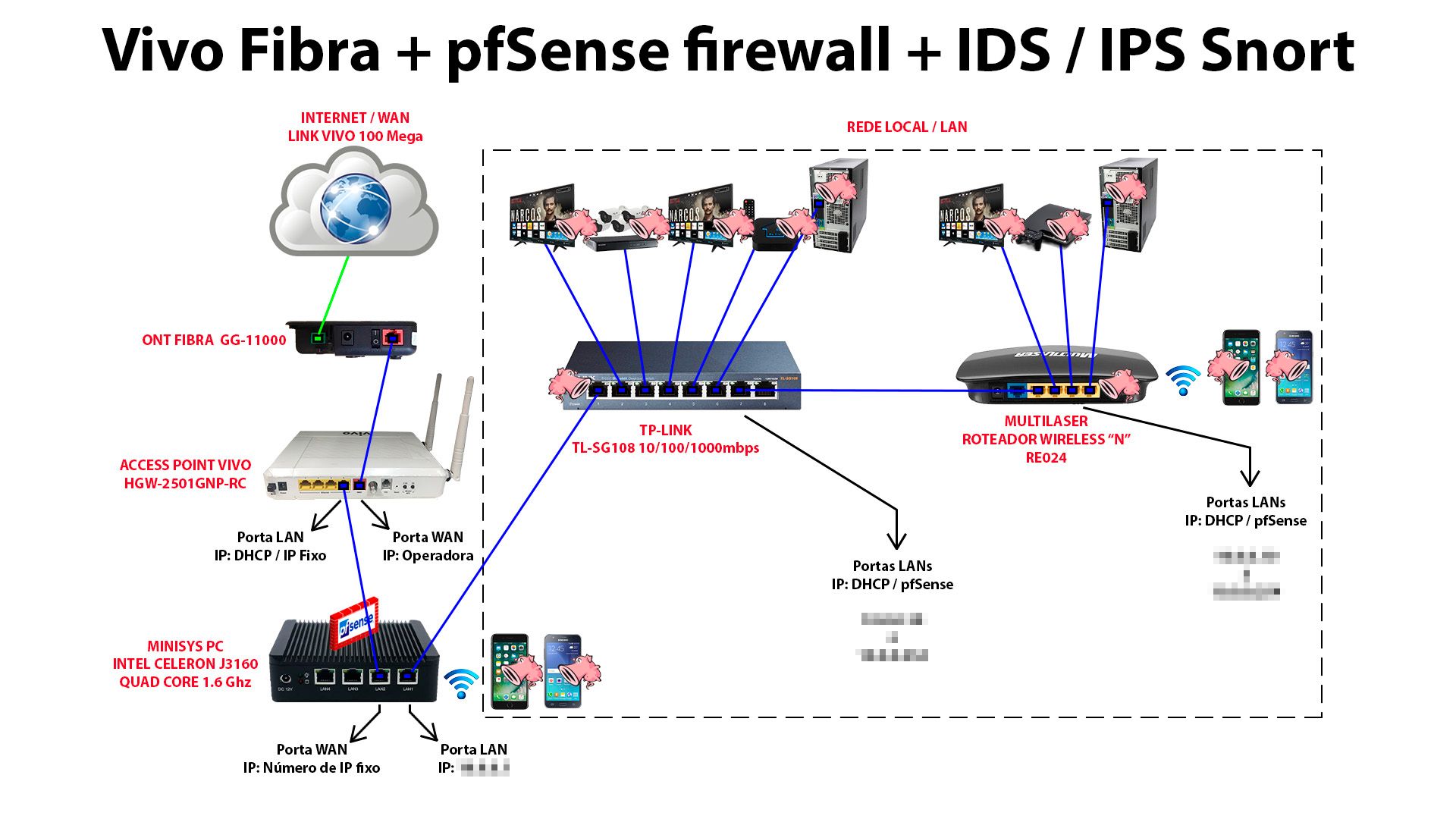 Acrescentando algumas informações que julgo serem importantes, é que nos meus estudos e nas minhas pesquisas aqui quando estava penando pra poder configurar a rede corretamente, cansei de ver nego dizendo aqui no fórum que configurou o access point da Vivo em PPoE com DMZ configurada juntamente com modo Bridge e os cambau pra poder conseguir rodar o pfSense, porém não fiz nenhuma configuração desse tipo, aliás não mexi quase nada nas configurações dele, pois o máximo que fiz nele foi configurar o Ip local que vai na entrada WAN do pfSense, onde o configurei para Ip estático e nada mais, somente isso. O access point da Vivo continua distribuindo normalmente os Ip's com o DHCP dele ativado, porém está inutilizado aqui por mim, pois o único Ip que uso é o estático que vai no pfSense e a rede de toda a residência está nele e pelo DHCP do mesmo somente.