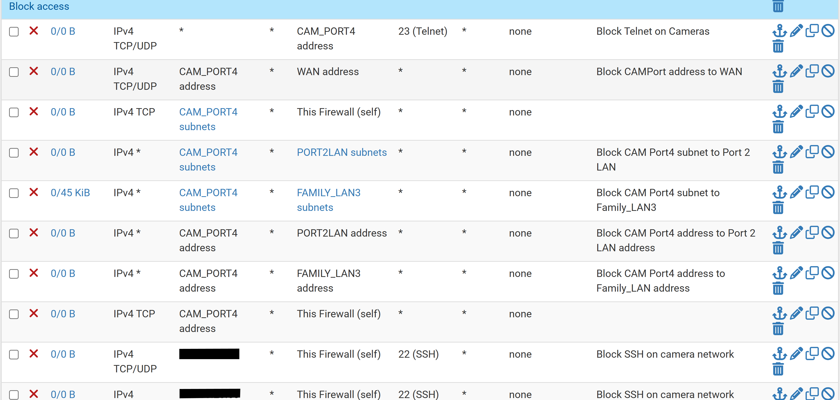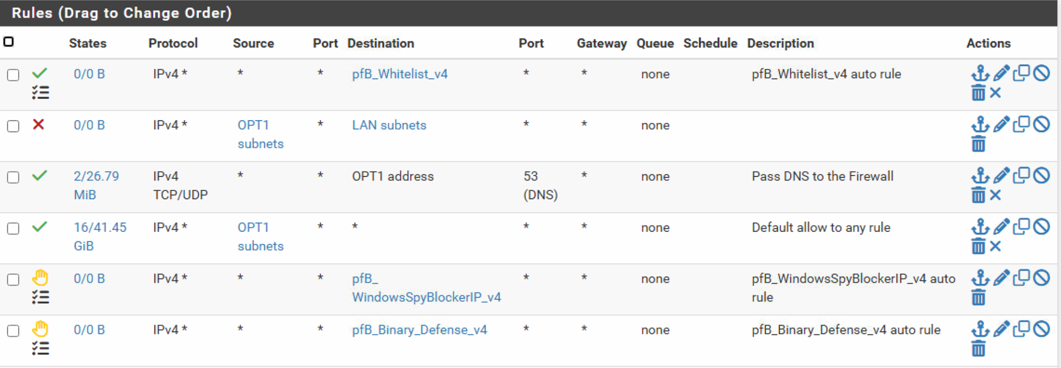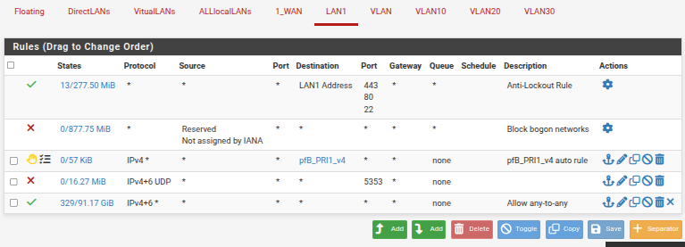 All incoming connections on this interface will be blocked until pass rules are added. Click the button to add a new rule". This confused me. I was convinced that a state without any rule is fully equivalent to a state with a "block all" rule (IPv4+IPv6, any protocol, any IP, any port, etc.). But at least for the OpenVPN tab, this is not true, as I tested that in case there are no rules on the OpenVPN tab, rules from OVPN1 are applied, and everything just works. I just tried to add a "block all" rule on the OpenVPN tab, and remote clients lost connection. So the mentioned message is quite confusing in this case. Because if that message was correct, remote clients would not have had a connection.