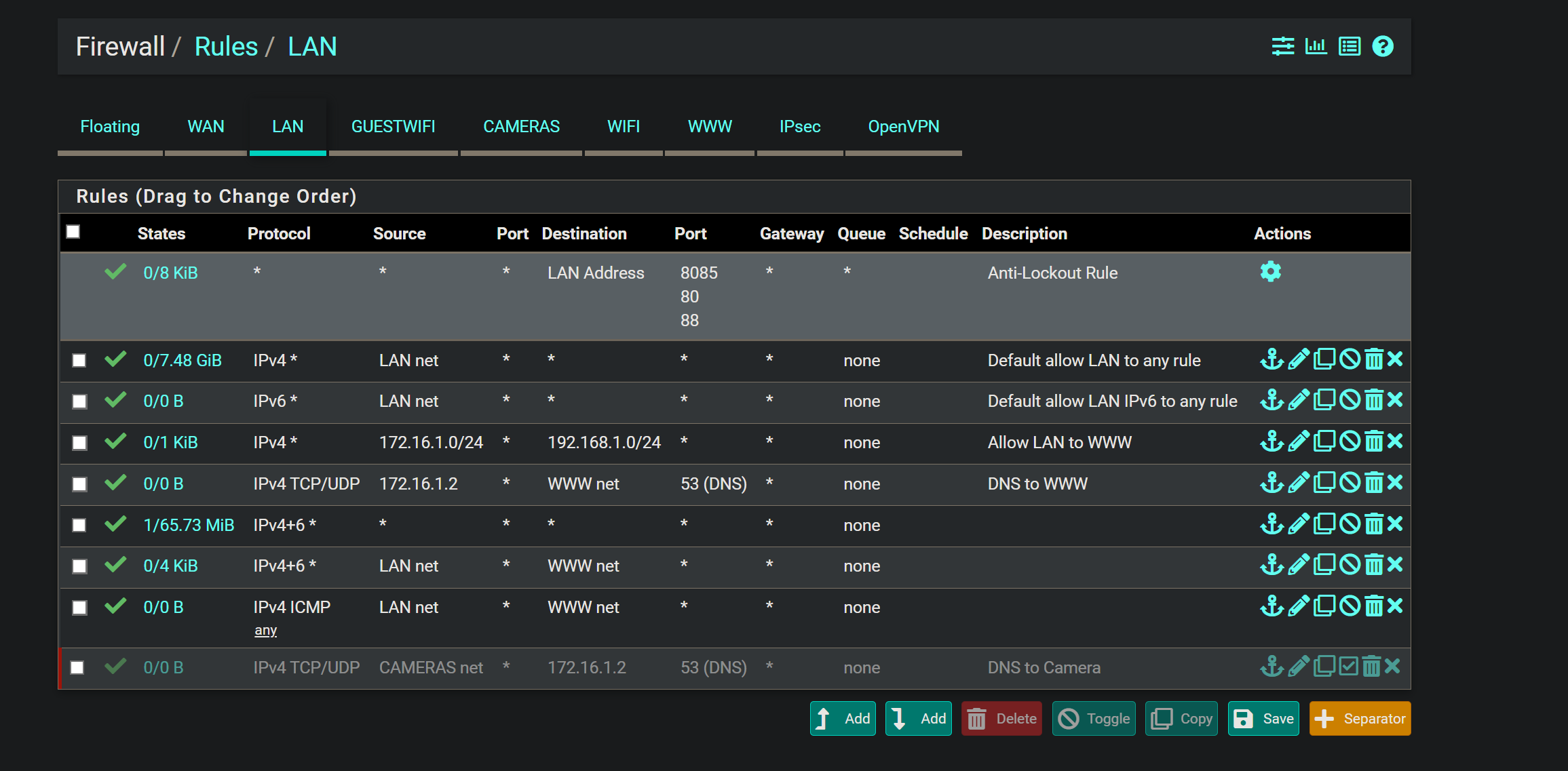 You're absolutely right: profiling firewall rules by CPU cycles and traffic impact can help drastically optimize a pfSense firewall ruleset. However, pfSense (based on pf from OpenBSD) does not natively provide per-rule CPU cycle measurements, unlike ipfw which does have more granular counters and optional DTrace integration on FreeBSD.