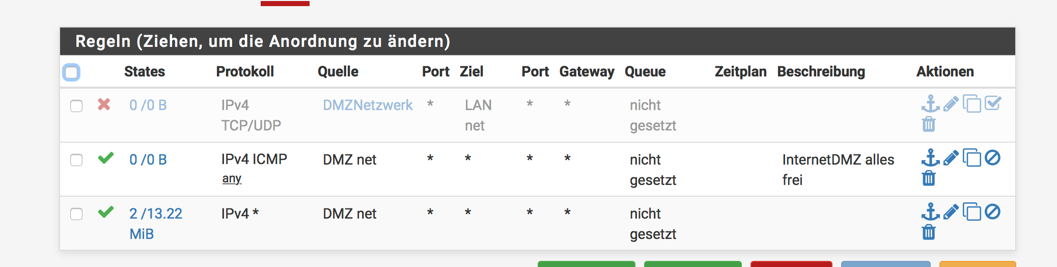 Regeln in der DMZ werden also am DMZ Netzwerkport, also incoming, abgearbeitet, bei einer block any to any rule wäre dann am Port Schluss.