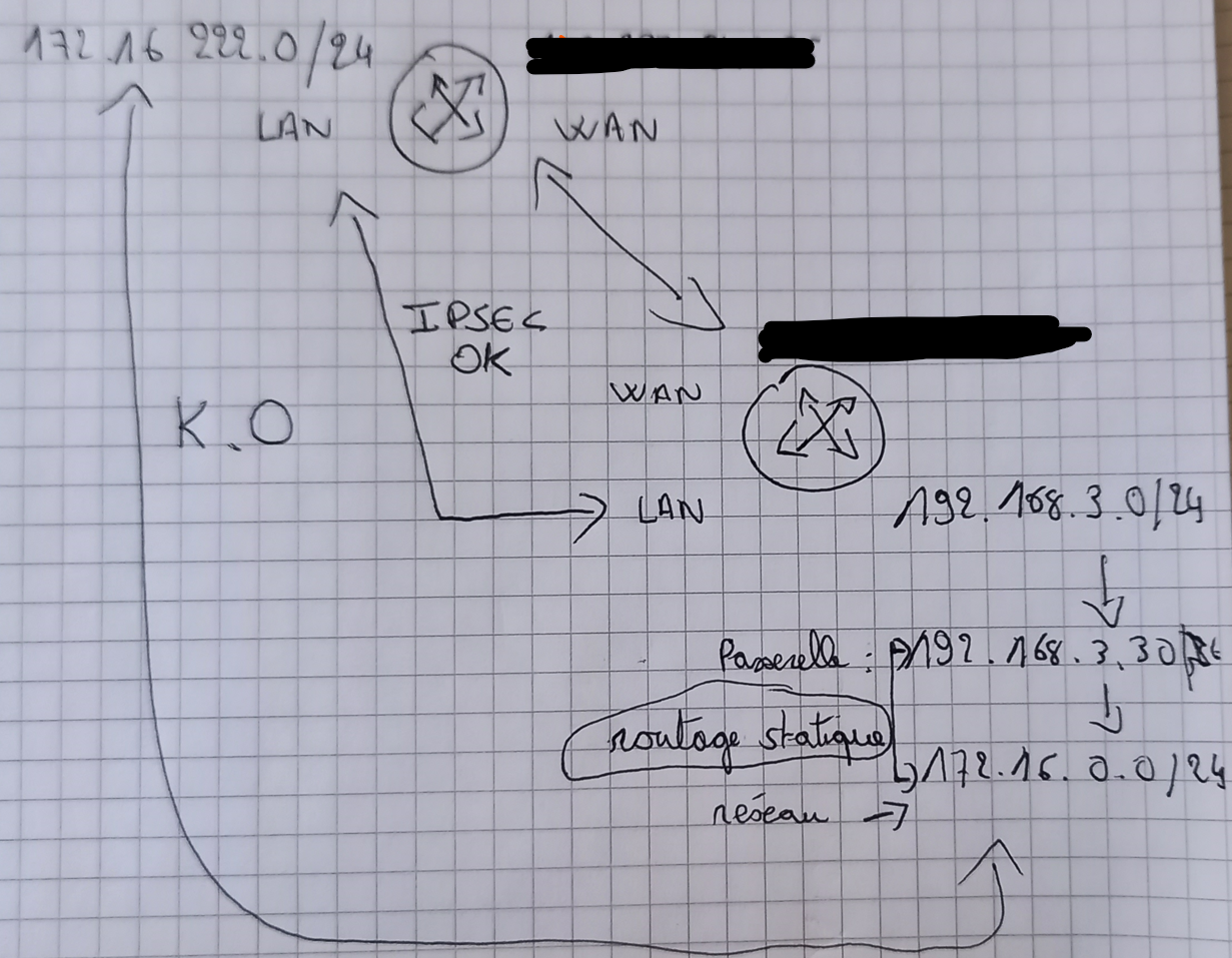 Bien. Maintenant les réseaux sont bien distincts, comme cela devrait l'être. Sur le site distant, vous avez un pfSense et un routeur. (Si vous éliminez le routeur, cela fonctionnera.) Il est nécessaire de commencer par s'assurer que pfSense accède et est accédé à toute machine du réseau via le routeur ...