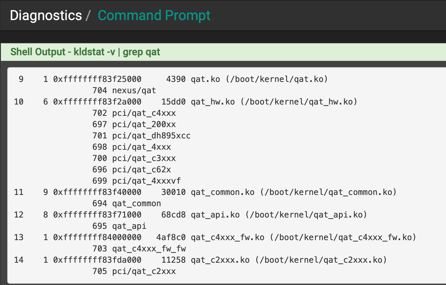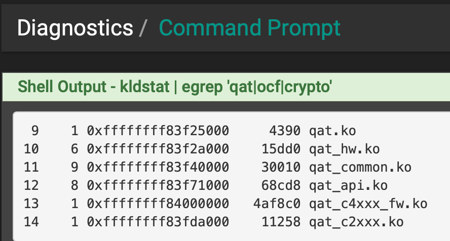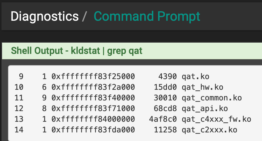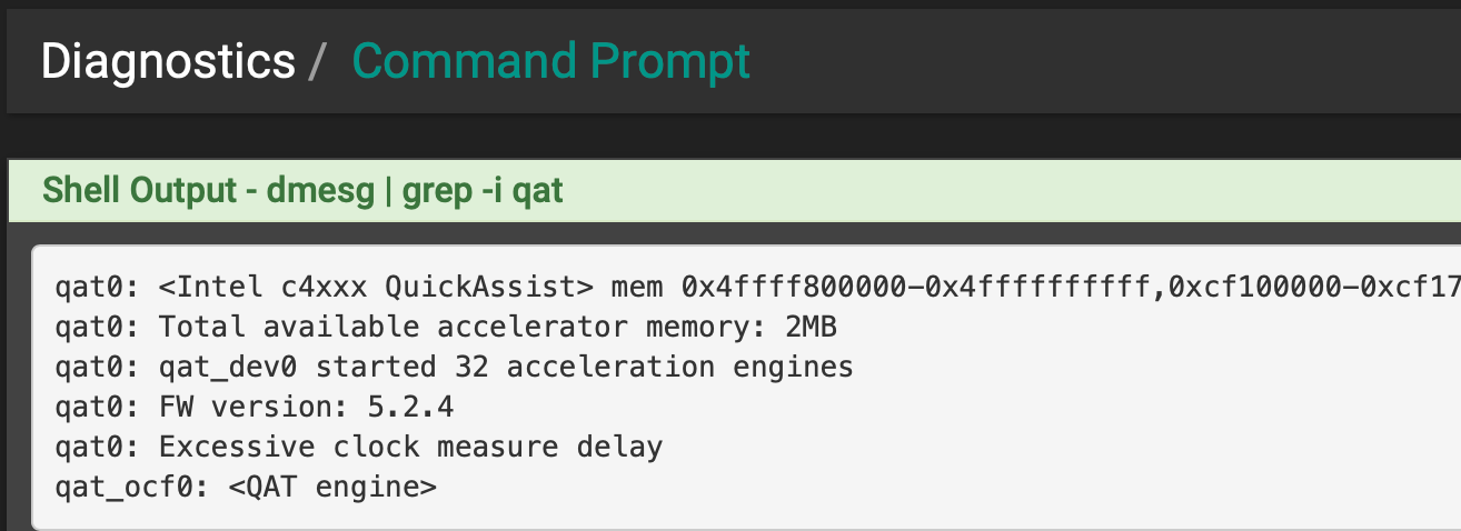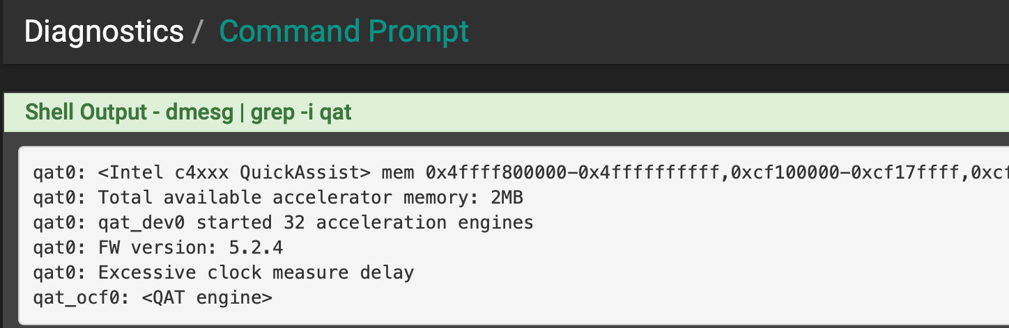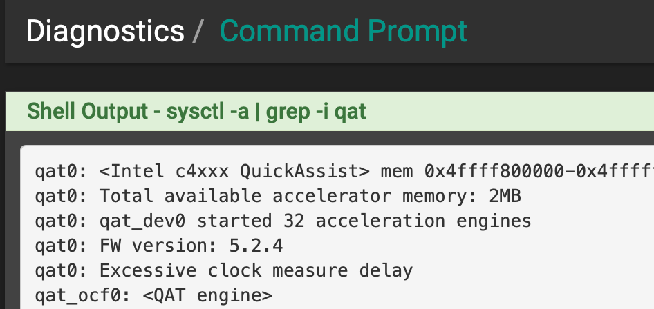 I have a Supermicro machine with a Xeon D-2796NT processor and pfSense Plus (25.11 Beta) loaded in it and have been wondering if there would be a way to have QAT fully activated in it. Have run some commands to see if the QAT drivers have been loaded and they show that they are (or at least I hope). However, the main pfSense web UI still displays QAT Crypto: No.