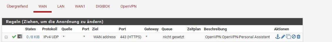 Korrekt - wenn du über beide WAN Erreichbarkeit haben willst - wäre das Aufsetzen von OpenVPN entweder mit der neuen MultiInterface Einstellung oder IMHO besser auf Localhost gebunden und mit Port Forwardings auf beiden WANs auf localhost/1194 weiterleiten. Dann klappt es mit beiden WANs und du kannst auch beide bspw. per DNS Namen in deine Client Konfig einbinden, so dass wenn WAN1 down ist WAN2 trotzdem geht und umgekehrt.
