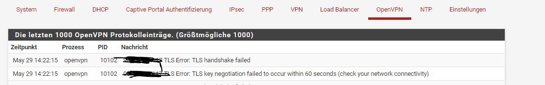 @medikopter Bitte mal auf beiden Seiten den TLS Key prüfen. Auf pfSense Seite ist das im OpenVPN Server die Textbox "TLS Key". Auf dem Client je nachdem ein extra File oder der Abschnitt der mit