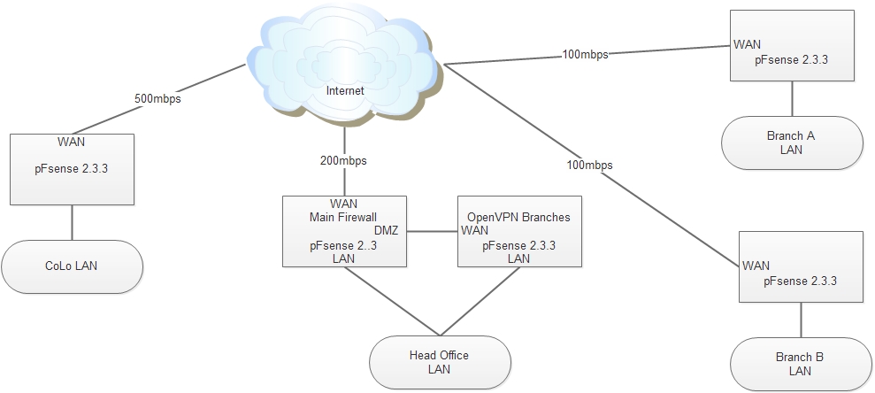 Now I have a problem, the new router "Main Firewall" is quick enough to saturate the ISP's connection (200mbps Telstra Fibre Optic). All branches are connected via OpenVPN, and this is not an issue with the other branches, as they are slower 100mbps links, but moving data to the CoLo' through OpenVPN now causes data loss as the Telstra 200mbps link drops data if we exceed the purchased speed.