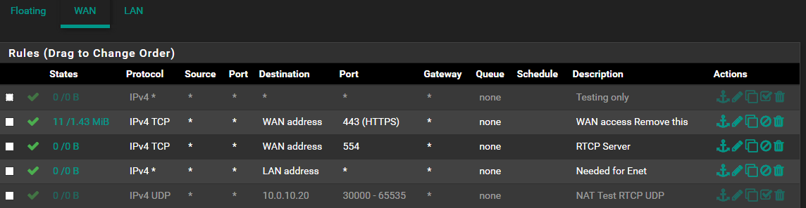 When I activate "allow all from wan" firewall rule and if I have static port option active in outbound nat rule the pfsense does NOT translate source IP address of outgoing RTP UDP streams and keep source IP 10.0.10.20 while RTP traffic flow to WAN RTCP client somewhere in the internet. I can see this if I collect traffic dump on WAN interface of pfsense.