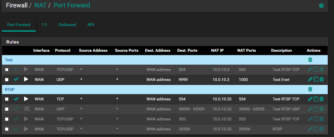 I am sure I've catch a bug in pfsense software. I have RTCP server on tcp port 554 in my LAN with LAN IP 10.0.10.20 and gateway 10.0.10.1 which is pfsense virtual machine of version 2.4.3. I have simple pfsense config with only several nat and firewall rules which allows access to my RTCP server from WAN using port forwarding:
