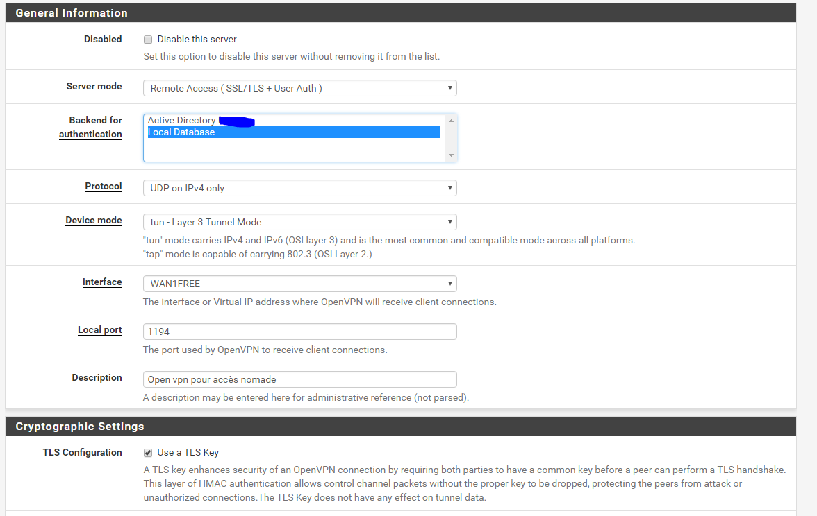 dev tun persist-tun persist-key cipher AES-256-CBC ncp-ciphers AES-256-GCM:AES-128-GCM auth SHA1 tls-client client resolv-retry infinite remote XXXXXXXXX 1194 udp verify-x509-name "Certificat Serveur Partage VPN" name auth-user-pass pkcs12 pfSense-UDP4-1194-XXXXX.p12 tls-auth pfSense-UDP4-1194-XXXXX-tls.key 1 remote-cert-tls server
