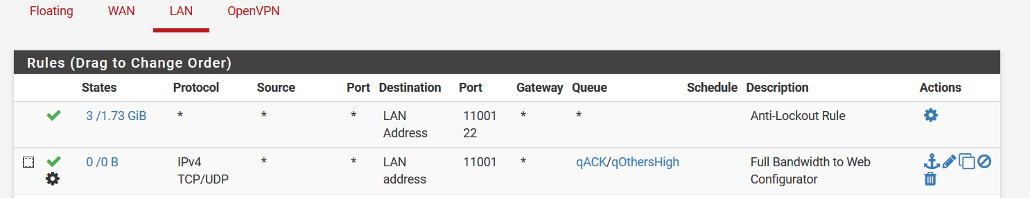So I've setup a traffic shaping using the wizard and enabled the P2P Catch all option and gave the P2P traffic 1% of upload and download bandwidth. My Network traffic improved dramatically, but im having a difficulty browsing the PFSense web configurator because i set the web configurator port to port: 11001. Now the shaper flagged the traffic as P2P. I have added rules in floating and LAN to assign the traffic to high priority queue but no traffic is passing to this rule.