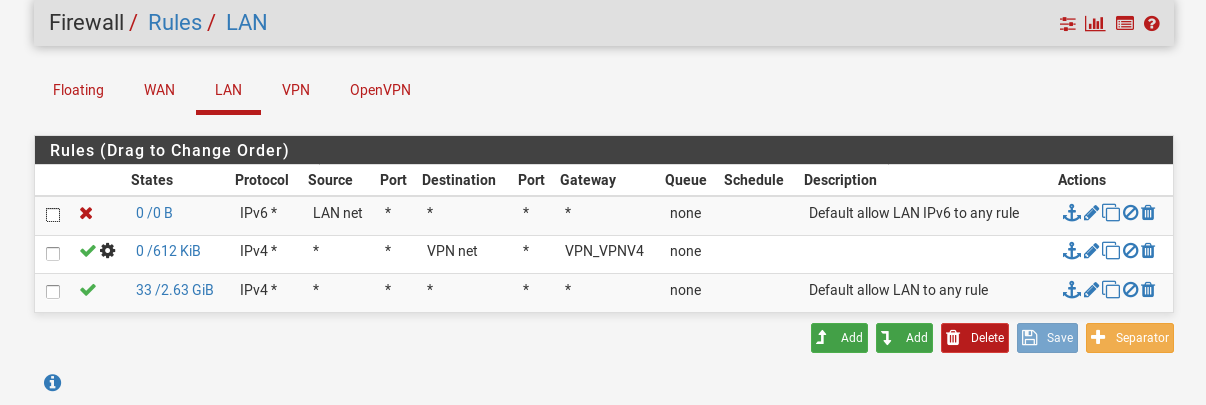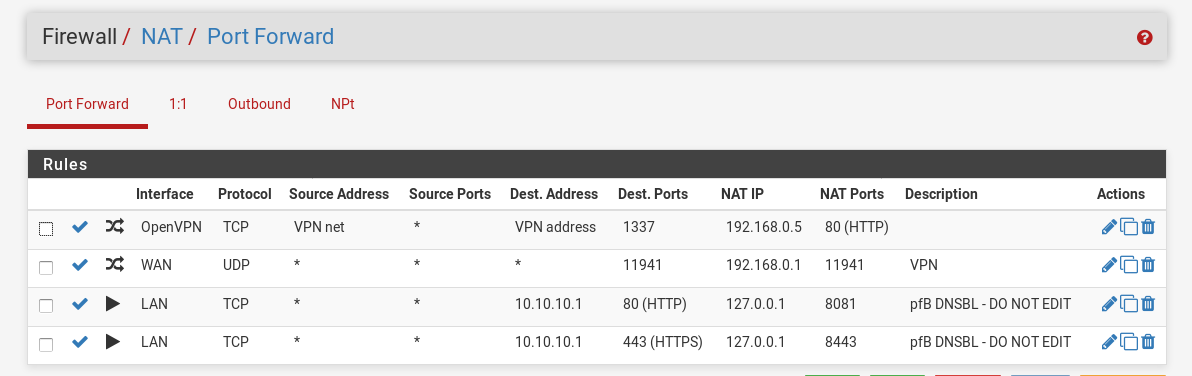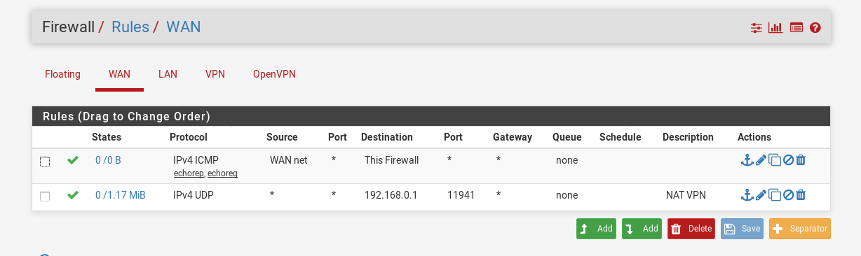 I'm running PfSense in a VirtualBox on my Debian host system and try to route traffic from my VPN to a web server running in my LAN network my goal is to access it over a specific port on my VPN Gateway and I can't find out what is wrong with my configuration. Another maybe corresponding problem is, that clients can reach each other by pinging inside my VPN network but streaming (for example with Iperf) doesn't work, but stream from PfSense to the clients does work fine.Here you can see my configuration: