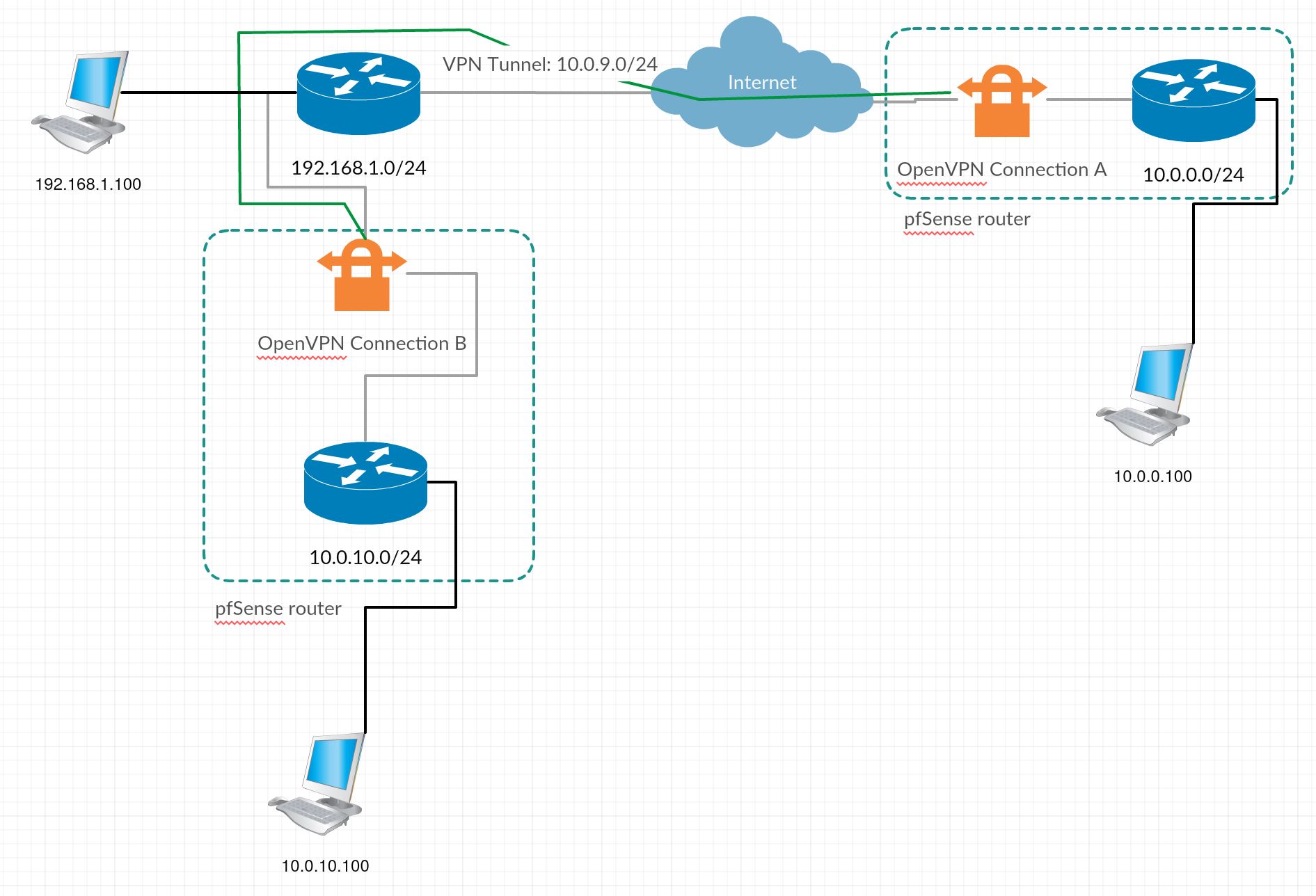 Where I am able to communicate from 10.0.0.100 with 10.0.10.100 and from OpenVPN Connection A interface to 192.168.1.100. If I try to communicate from 10.0.0.100 to 192.168.1.100 I am unable to let traffic pass. I have the server OpenVPN Connection A, configured to route all 10.0.10.0/24 and 192.168.1.0/24 to VPN Tunnel: