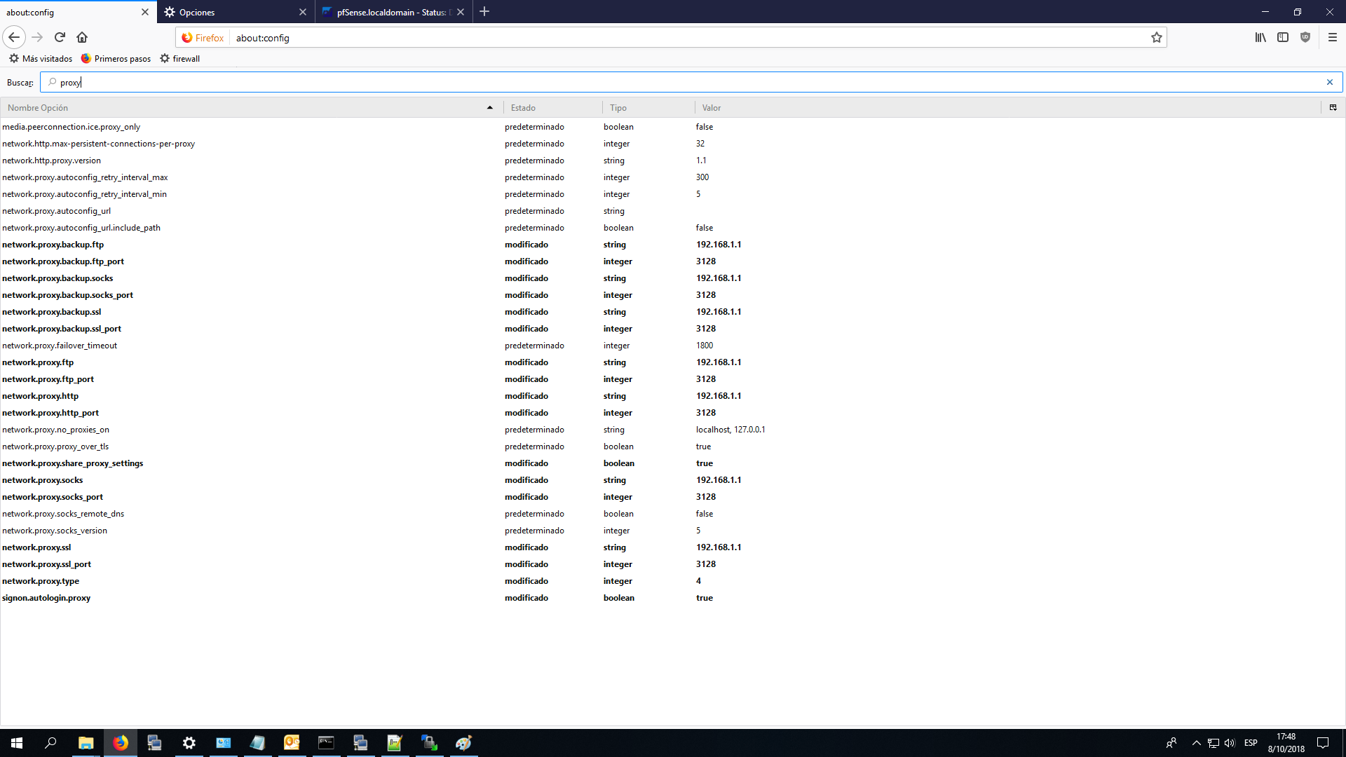 estoy corriendo el pfSense 2.4.4, tiene dos WAN que ya estan configuradas, la cuestion es que si pongo al Firefox con configuracion manual del proxy este lo toma correctamente, pero si pongo para que lo tome automaticamente este no funciona, la idea es que sea NO Transparente para no ir PC por PC a configurarlo. Capturas del about:config del firefox: