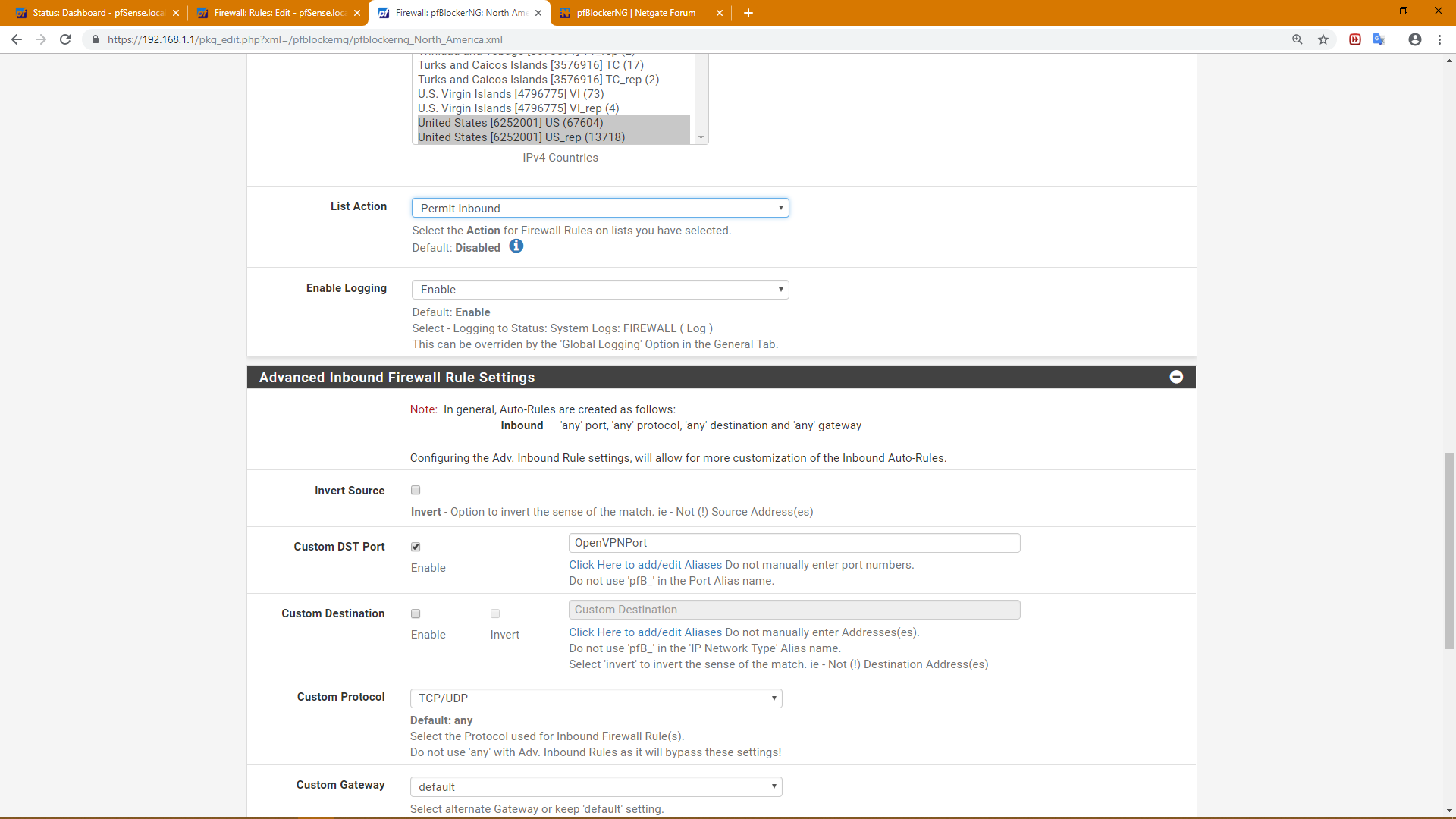 my question is...Is this the proper way of handling this from a security standpoint? is permitting in the north america list to that available port too broad? I don't know if my phone IP (via verizon) is static, and if i should just forget the geoip north america permit rule and allow the phone IP address only? I use pfblocker with many of the ip lists and feeds, paid Snort subscription lists , and suricata (WAN firewall rules screenshot below).