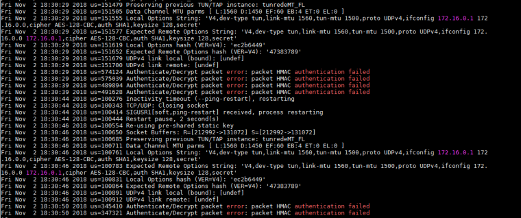 packet HMAC authentication failed is very often just down to wrong TLS Configuration or wrong key / key direction.