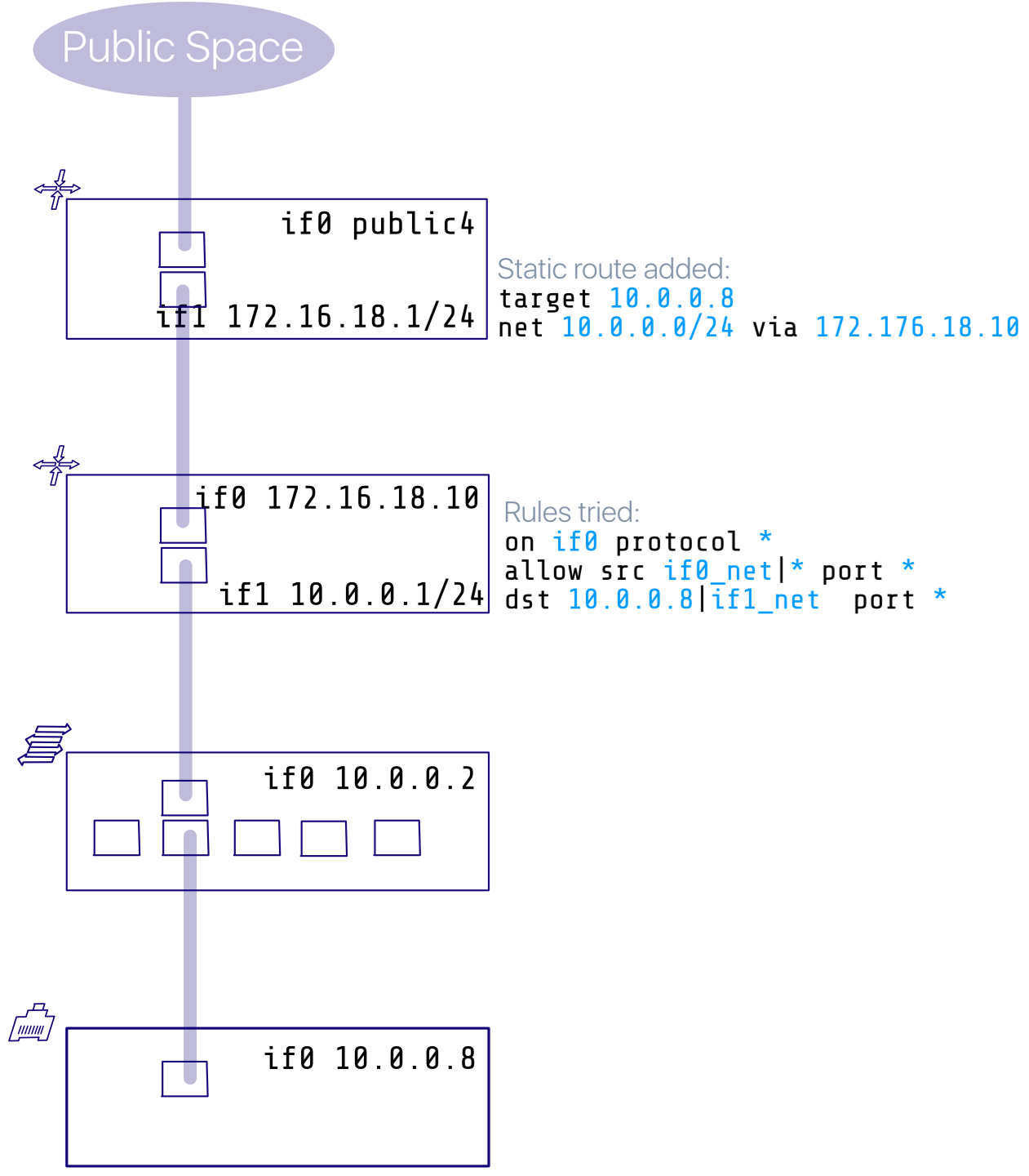 I also tried using as destination the upstream interface's address (172.16.18.10 here above in my example doodles) on the middle router but that sort of would be NATting, don't it? Didn't work anyway; maybe because I didn't actually did the port translation rules, only the firewall rules.