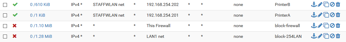 By the way - I'm assuming your first screenshot of rules is on your STAFFWLAN interface. If I've learned anything from lurking on these forums, it's that rules should be written with all the "blocks" at the top, followed by all the "allows" at the bottom.