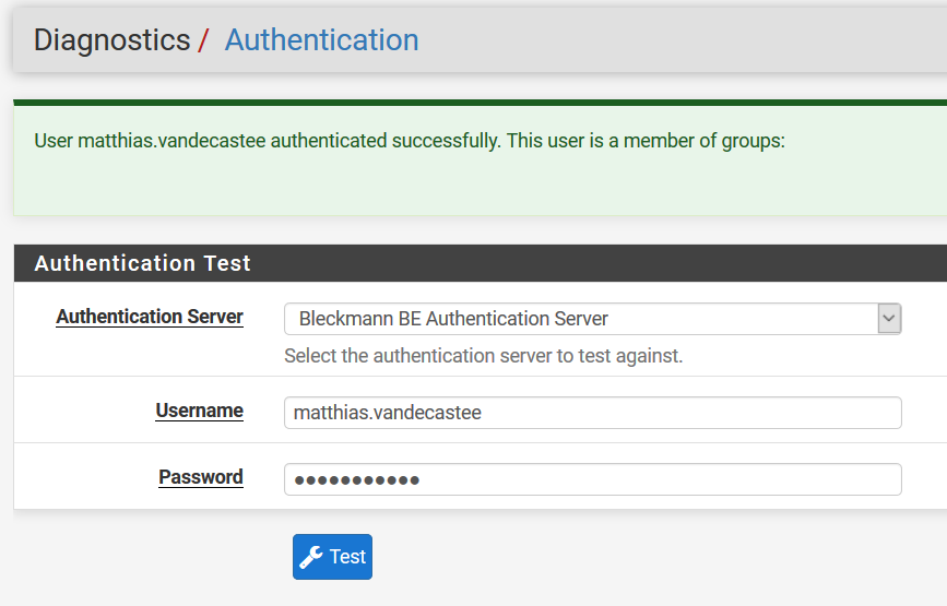 We are able to log in using the Radius authentication tool inside pfSense. We need to use "matthias.vandecastee" (which makes sense, since the sAMAcount name in AD is used)