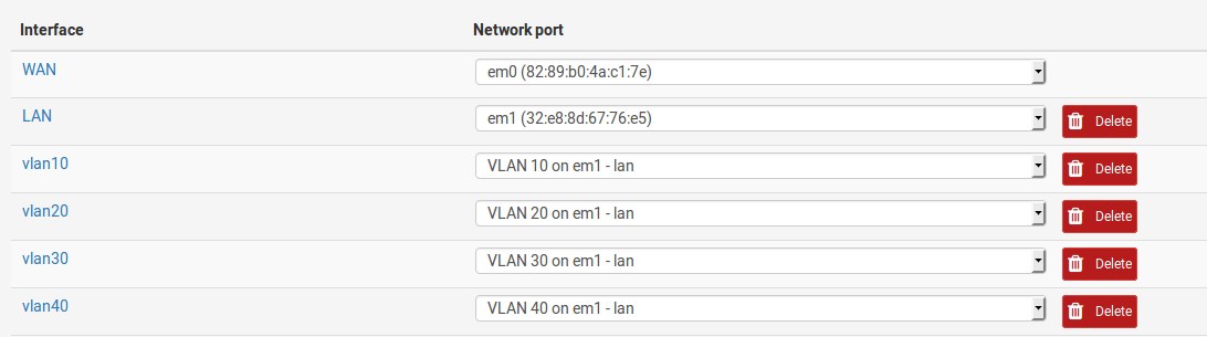 Well..I am. Doing VLANs this way is recommended by Proxmox. Read up more here: linkauto lo iface lo inet loopback allow-ovs vmbr0 allow-vmbr0 eno1 iface eno1 inet manual ovs_type OVSPort ovs_bridge vmbr0 auto vmbr0 iface vmbr0 inet manual ovs_type OVSBridge ovs_ports eno1 auto vmbr1 iface vmbr1 inet static address 192.168.0.2 netmask 255.255.255.0 gateway 192.168.0.1 ovs_type OVSBridge ovs_ports vlan10 vlan20 vlan30 vlan40 allow-vmbr1 vlan10 iface vlan10 inet manual ovs_type OVSIntPort ovs_bridge vmbr1 ovs_options tag=10 allow-vmbr1 vlan20 iface vlan20 inet manual ovs_type OVSIntPort ovs_bridge vmbr1 ovs_options tag=20 allow-vmbr1 vlan30 iface vlan30 inet manual ovs_type OVSIntPort ovs_bridge vmbr1 ovs_options tag=30 allow-vmbr1 vlan40 iface vlan40 inet manual ovs_type OVSIntPort ovs_bridge vmbr1 ovs_options tag=40 -