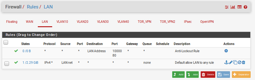IPv4 Routes Destination Gateway Flags Use Mtu Netif Expire default WAN GATEWAY UGS 1058841 1500 em0 10.1.0.0/24 10.1.0.2 UGS 1746 1500 ovpns1 10.1.0.1 link#11 UHS 0 16384 lo0 10.1.0.2 link#11 UH 0 1500 ovpns1 10.41.10.9 link#13 UH 3615 1500 ovpnc3 10.41.10.10 link#13 UHS 0 16384 lo0 10.72.10.5 link#12 UH 3632 1500 ovpnc2 10.72.10.6 link#12 UHS 0 16384 lo0 WAN IP/29 link#1 U 3640 1500 em0 WAN ANOTHER IP link#1 UHS 0 16384 lo0 WAN ANOTHER IP link#1 UHS 0 16384 lo0 WAN ANOTHER IP link#1 UHS 0 16384 lo0 127.0.0.1 link#4 UH 118 16384 lo0 192.168.0.0/24 link#2 U 5068 1500 em1 192.168.0.1 WAN GATEWAY UGHS 0 1500 em0 192.168.10.0/24 link#7 U 396258 1500 em1.10 192.168.10.1 link#7 UHS 0 16384 lo0 192.168.20.0/24 link#8 U 74842 1500 em1.20 192.168.20.1 link#8 UHS 0 16384 lo0 192.168.30.0/24 link#9 U 0 1500 em1.30 192.168.30.1 link#9 UHS 0 16384 lo0 192.168.40.0/24 link#10 U 3 1500 em1.40 192.168.40.1 link#10 UHS 0 16384 lo0 -