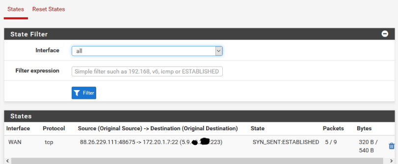 It looks like the reply from the server never gets back to the client, so probably the packet is being misrouted on the way back out. The easiest way that can happen is if your WAN is not properly setup. For example, with a static IP address on WAN, if you do not have a gateway set on Interfaces > WAN, then it might not reply back properly if you have more than one WAN or a problem with your default gateway settings.