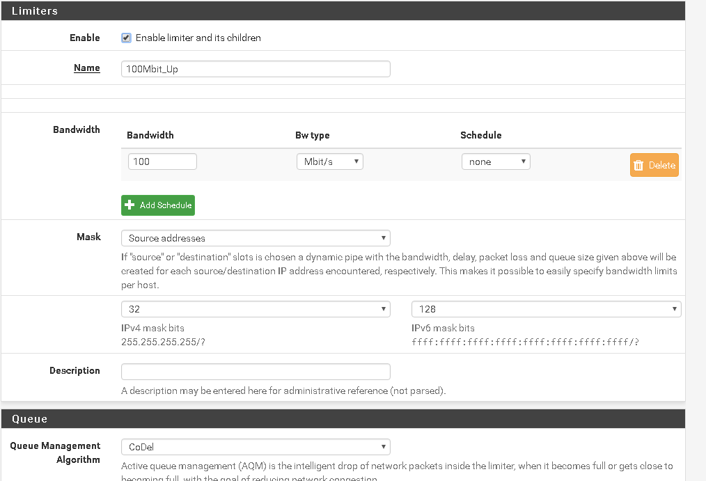 I have set up Limiter 100/100 (Download/Upload) and applied it to my LAN on a Aliases internal LAN IP group. All is working ok, speed test shows correct results.The problems start when a client starts ASPERA connect and starts downloading. Sometimes (not all the times) although the LAN traffic graph shows 100Mbit Download the WAN graph peaks at 200 Mbit Download and bottlenecks all internet traffic on the network.