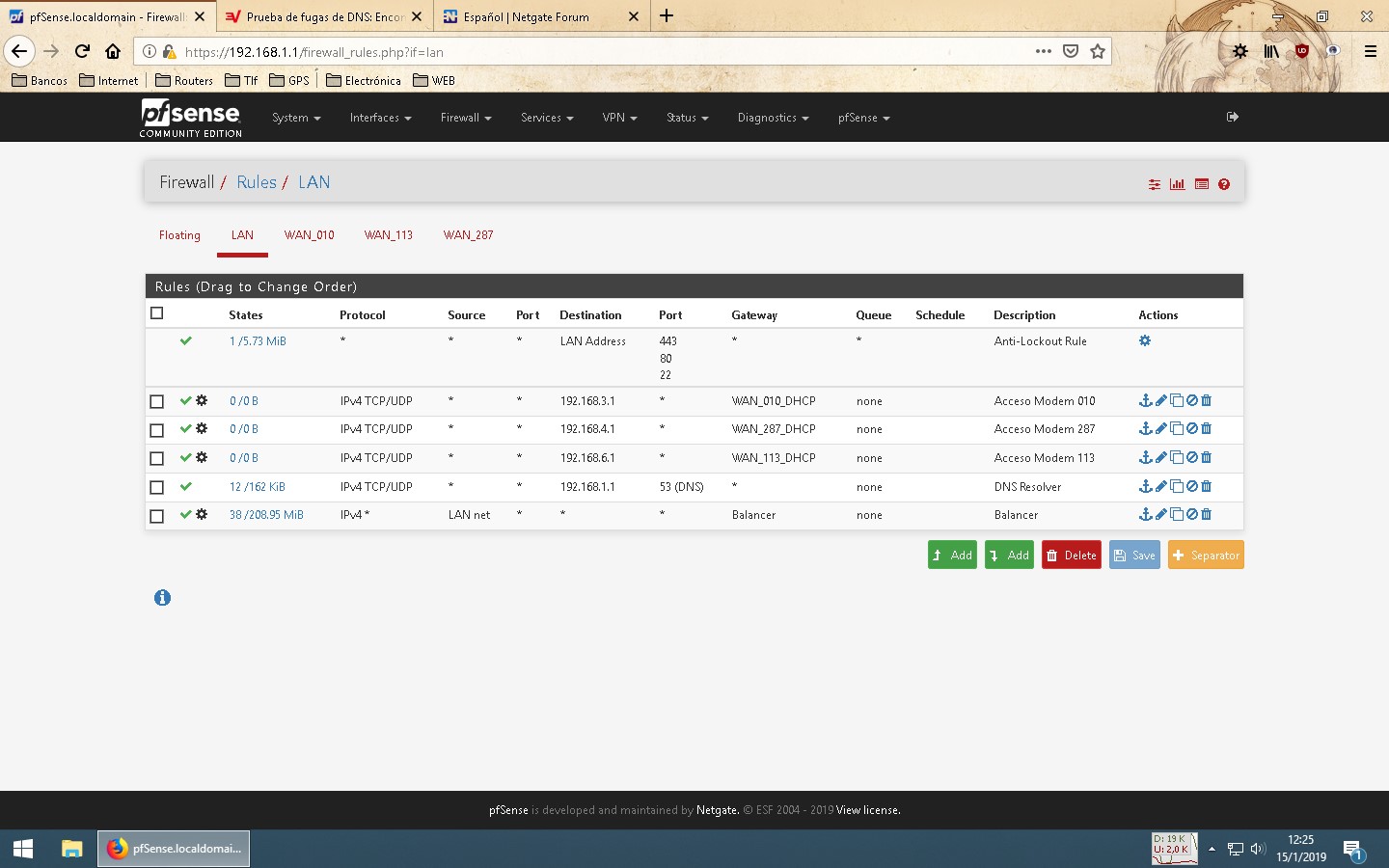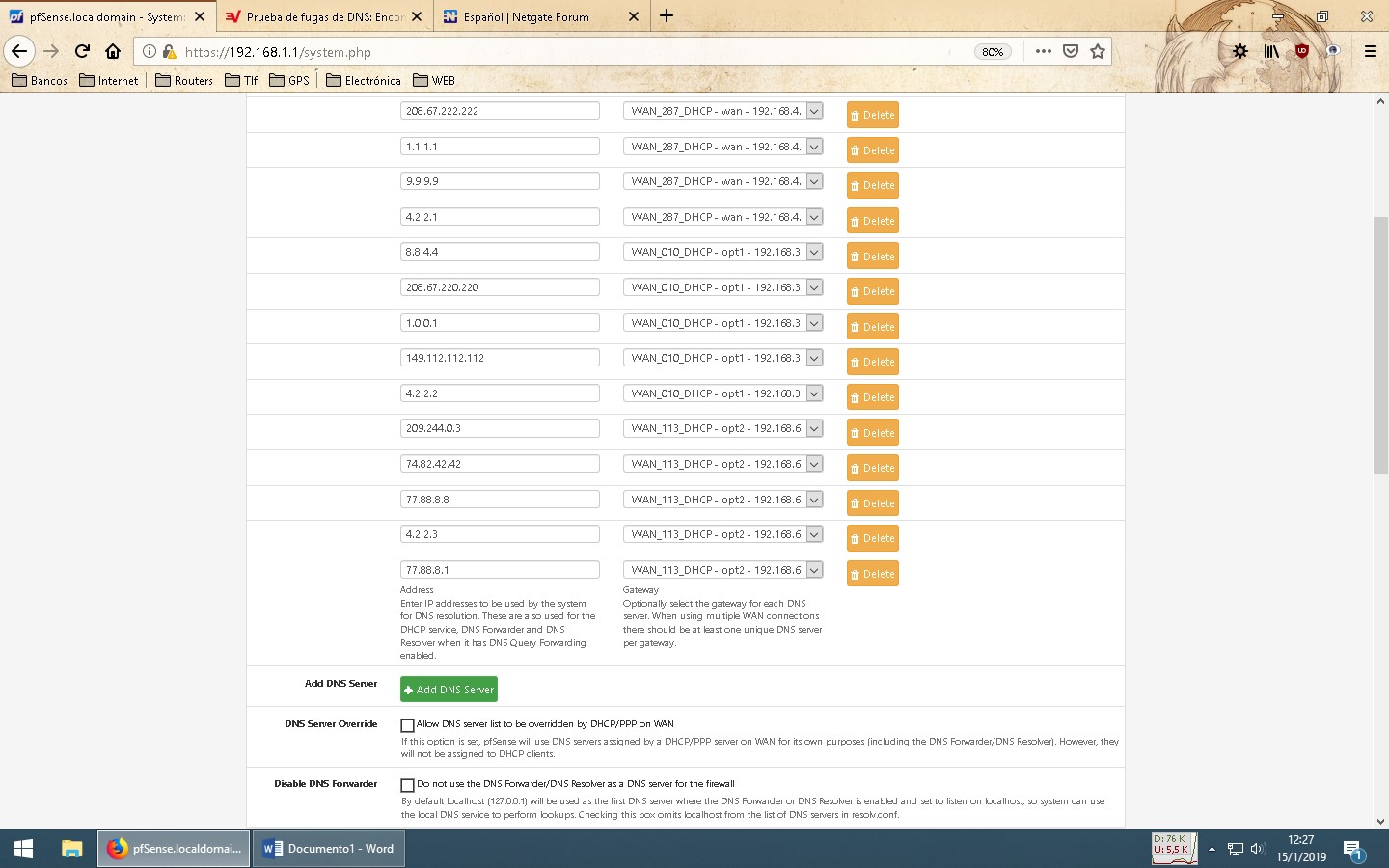 Buen día, Tengo un problema con los DNS. Paso a explicar: En la pestaña general, tengo activados diversos DNS (OpenDNS, Google, etc) para cada una de las 3 WAN que conforman mi Balancer (configurado y funcionando). DNS Resolver está activo. Si NO selecciono "DNS Forwarding", al consultar en dnsleaktest, el UNICO DNS que aparece activo es "Cantv.net" (que añado además en los 3 modems ADSL que están conectados, tienen por DNS 8.8.8.8 y 208.67.222.222), que es el del proveedor (No debería aparecer ya que no está configurado. Es decir, no consigo que pfsense me funcione como servidor DNS ya que si NO activo la opción "forwarding" en DNS Resolver, solo detecta "cantv.net" como DNS. Adjunto algunas capturas de pantalla.