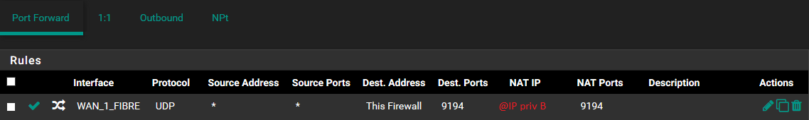 This pfSense is behind the main gateway (also on pfSense) which forwards trafic (UDP port 9194) to the VPN but only from my ISP#1 (WAN_1_FIBRE).