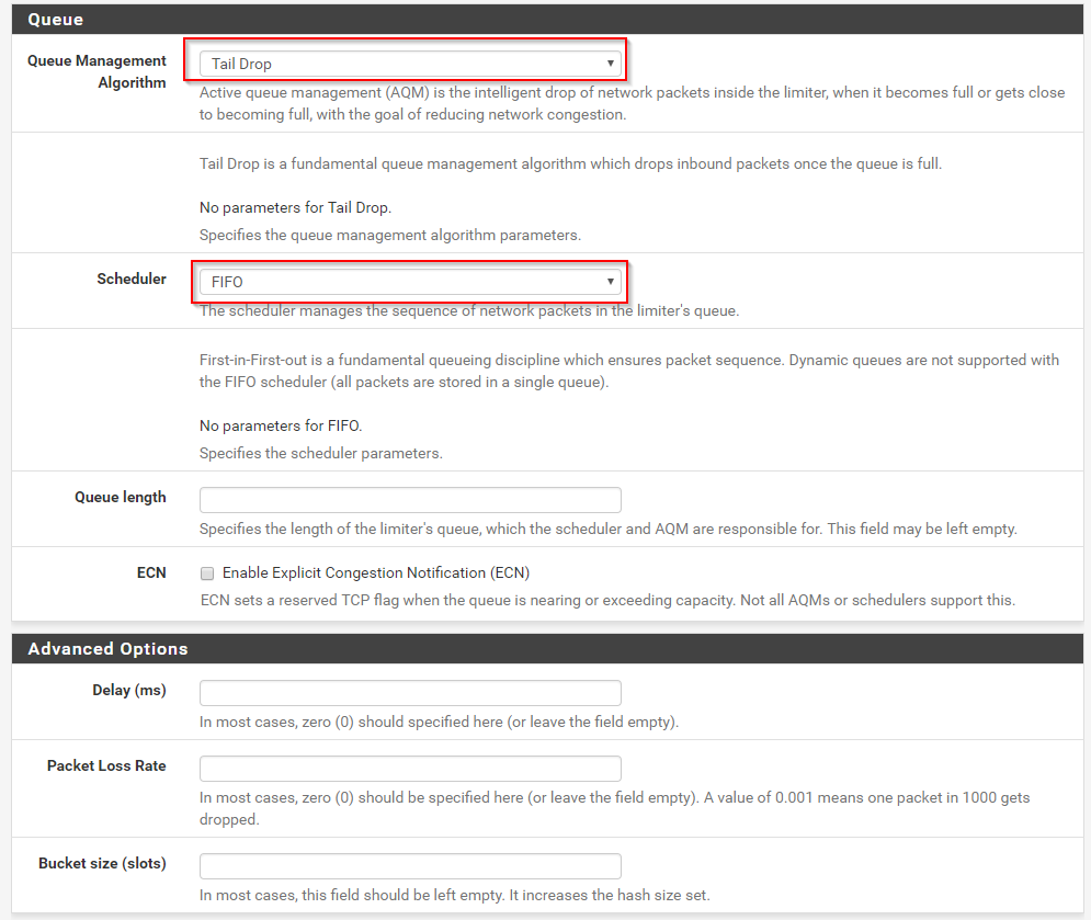 Info "Queue Management Algorithm" e "Scheduler" su Limiters