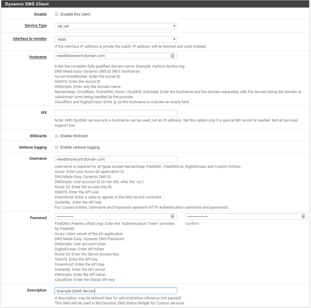 I had trouble finding a definitive answer for how to properly configure Dynamic DNS in pfsense (2.4.4_2 presently) to update a Dynamic DNS record in he.net so here goes: