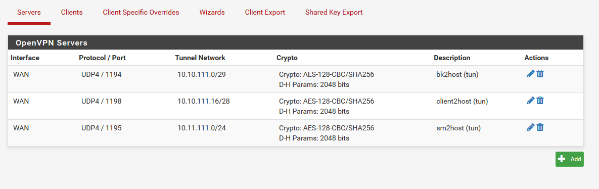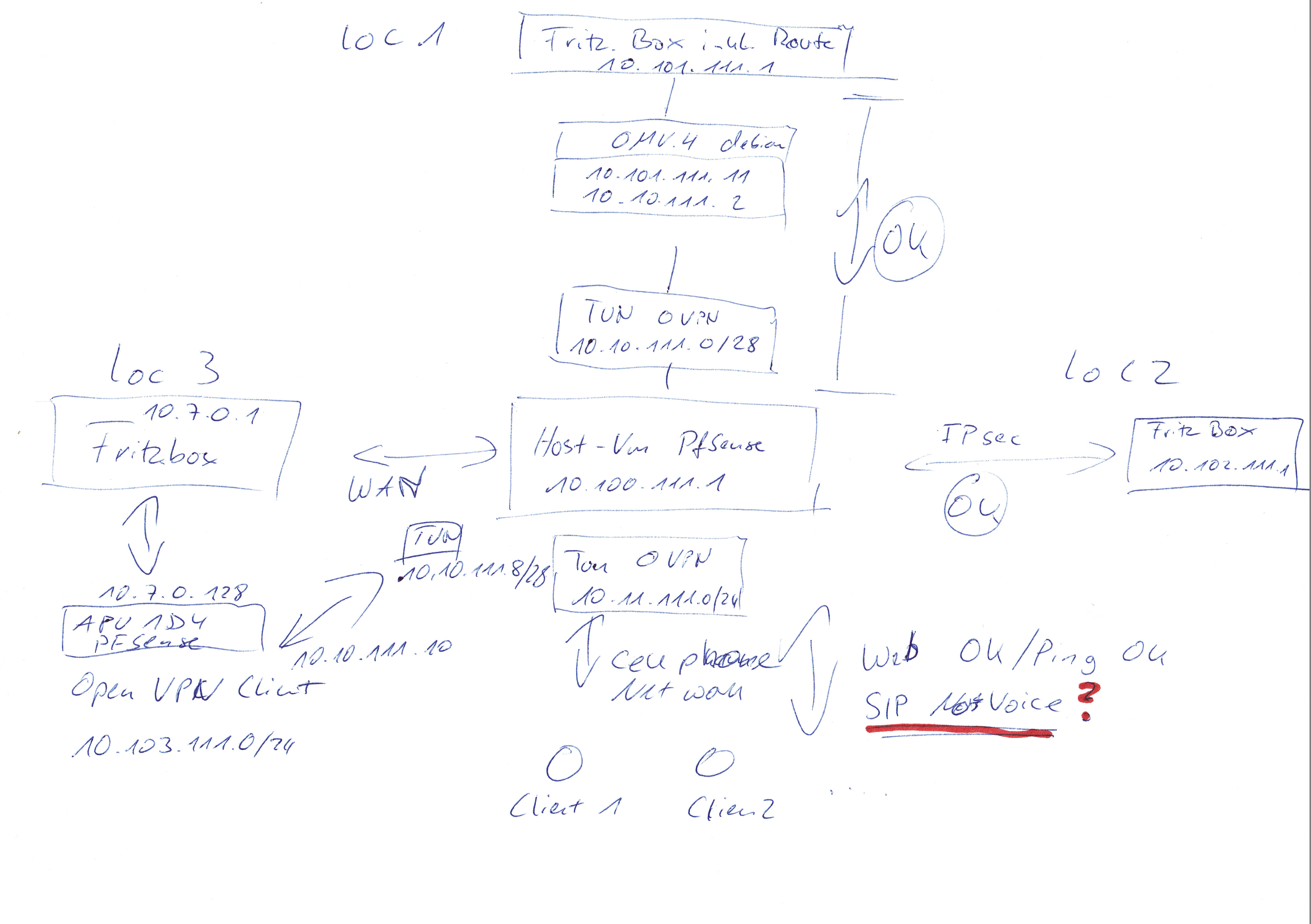 loc1 (changed sucessfully from IPsec to oVPN) with the network 10.101.111.0/24 with the oVPN client being 10.101.111.11 (OMV4 debian server and static routs from Fritz.Box to .11 for the host network, not the tunnel) Tunnel is 10.10.111.0/28 while host is .1 and OMV client is .2 (works greate)