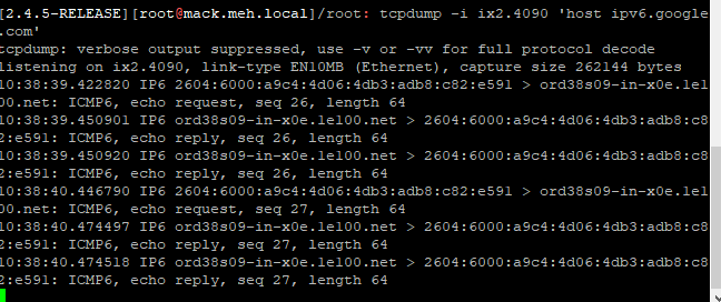 If you'll look at the screenshot of the ping which is a tcpdump of the ipv6 traffic on my router, my router with a 2602: address sends an ICMP request out to google. Google replies twice and the packet gets back to the WAN interface on my router.