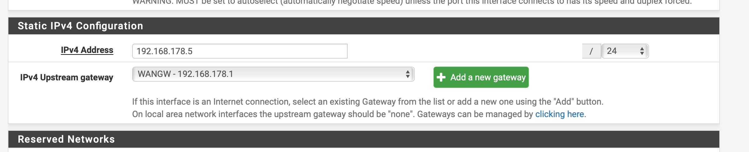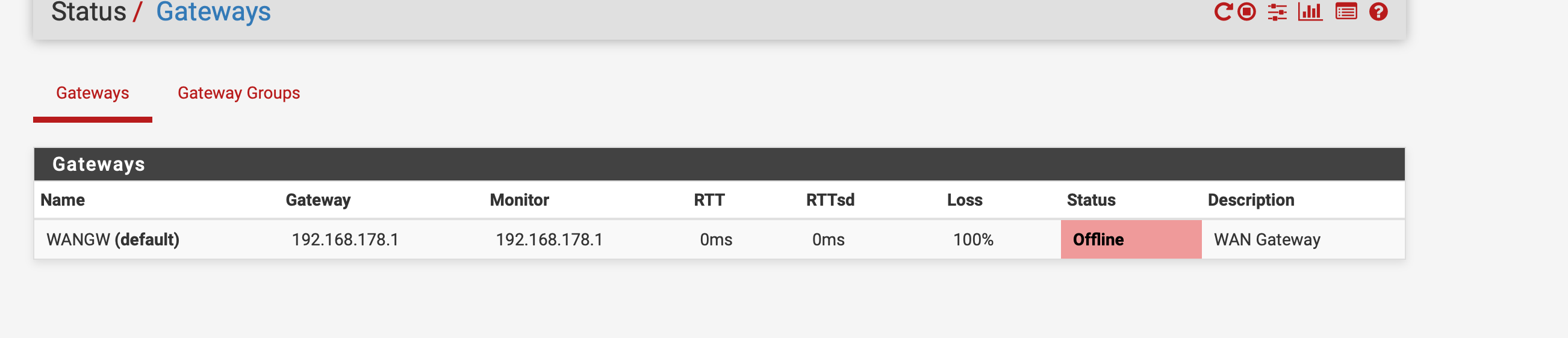 Ich habe nun versucht die Fritzbox als Standardgateway im WAN der pfsense anzugeben. Leider bleibt das WAN offline.