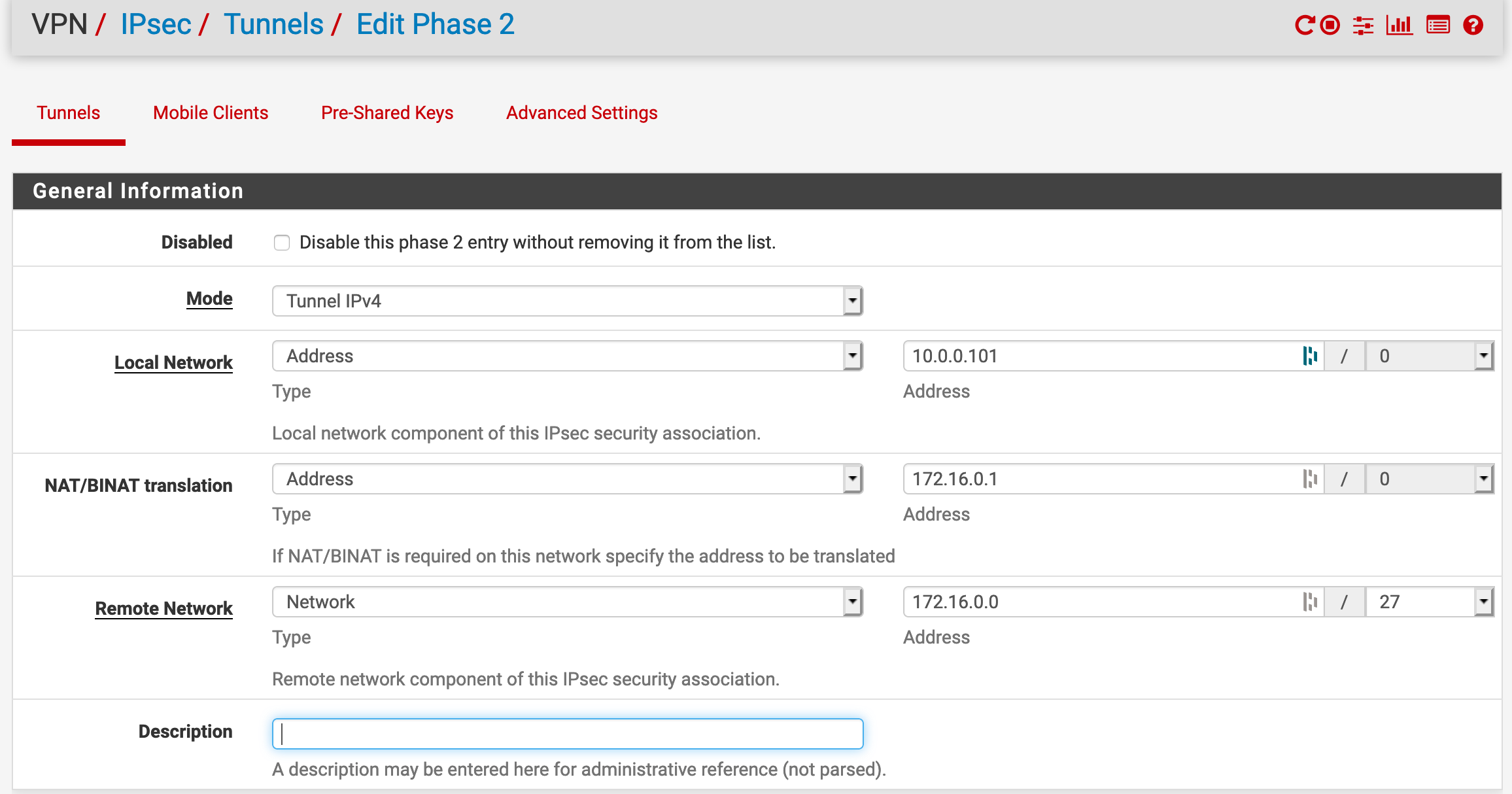 On one side, I have a (Site A - 10.0.0.1/24.) PFsense connected with a site-to-site IPSEC tunnel. Site B is on 172.16.0.0/27 and has a few machines that need to get their traffic forwarded/pushed to specific devices on the other side.