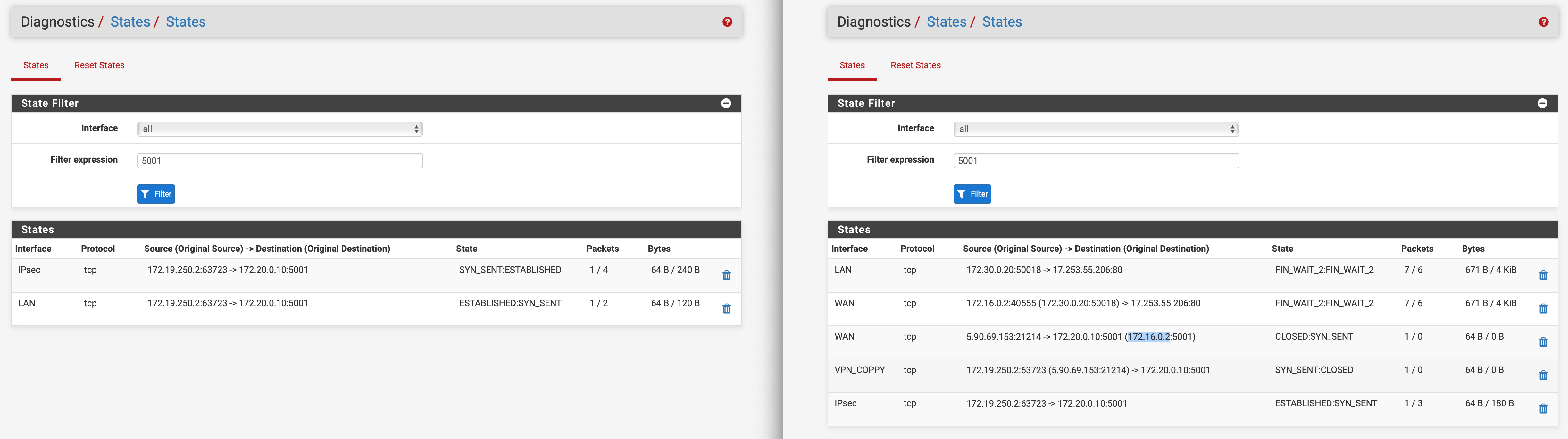 No blocked connection are listed in the firewall logs, and this is the States view from both sides (Site 1 on left and Site 2 on right).