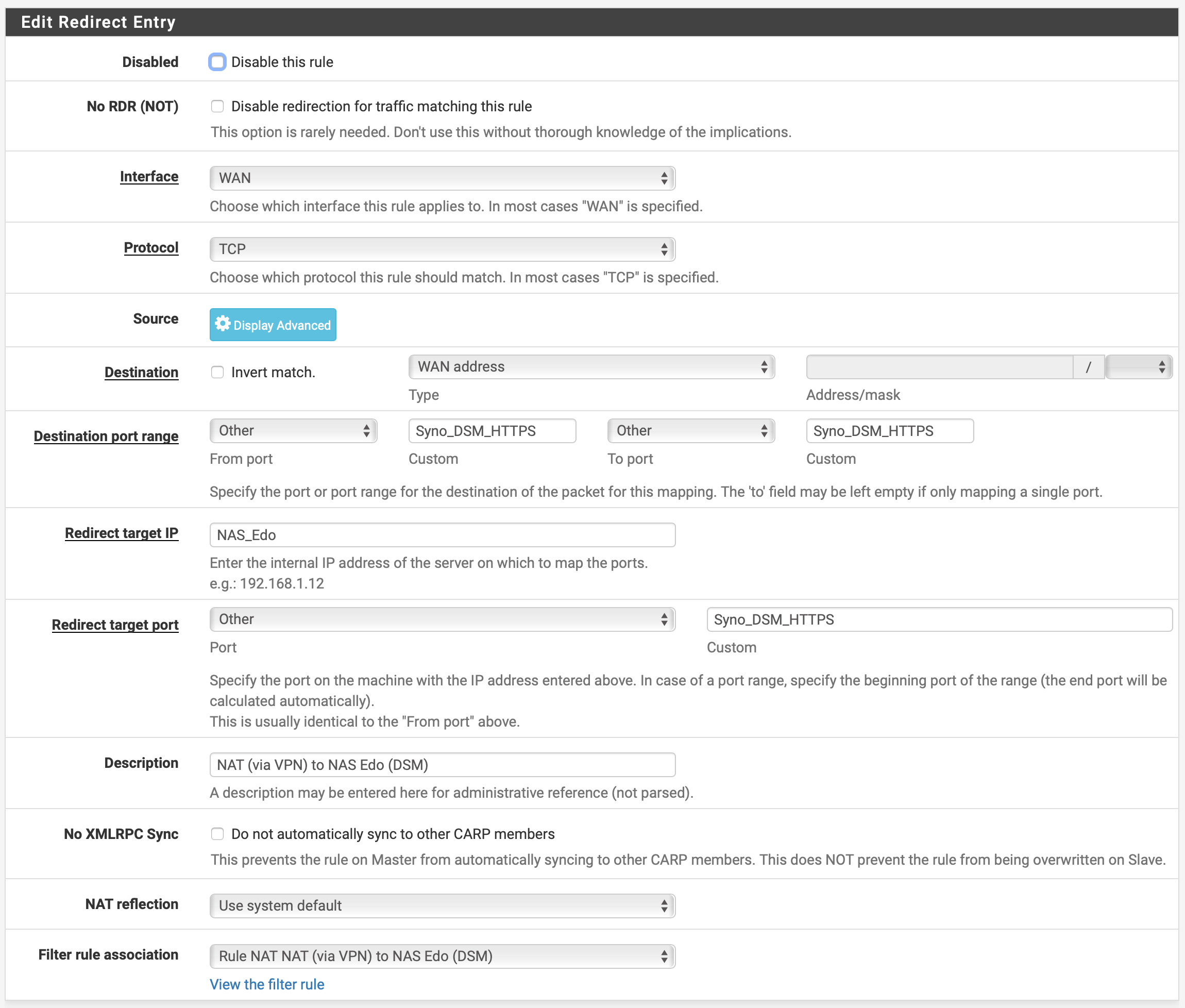 Now I need to access directly a resource on Site 1 (a port of the NAS) from the internet, using the public IP of Site 2.