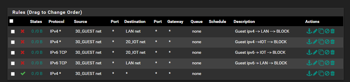 Then, in each vlan ruleset, a single before-last rule that says block from this-net to RFC_1918. Any explicit access can be granted prior to this rule, and the last rule is the allow this-net to any rule to get out to the Internet.