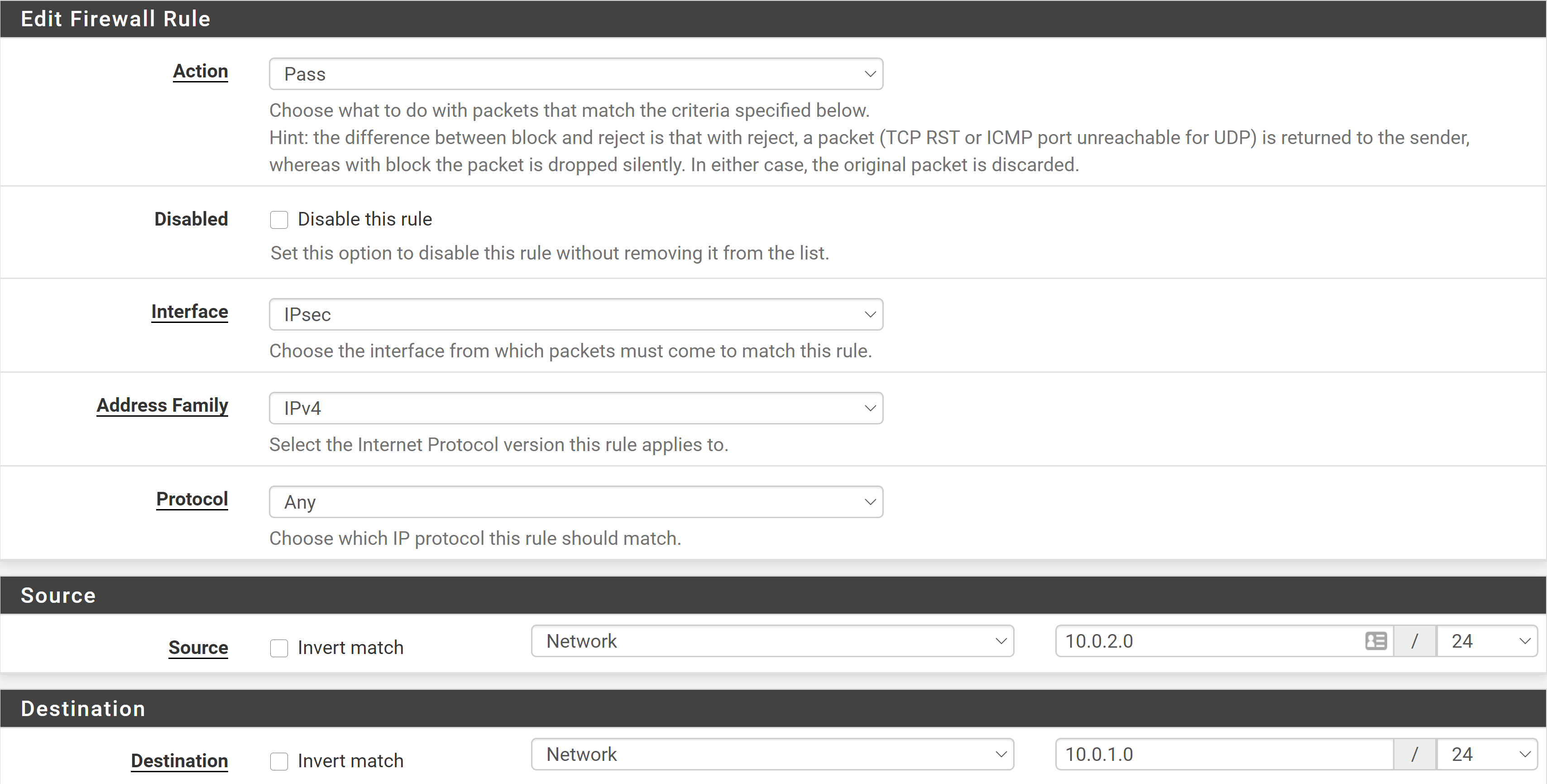 - IPSec firewall rules on pfsense.cozynet are set to allow Any from 10.0.2.0/24 and all other traffic is otherwise working fine