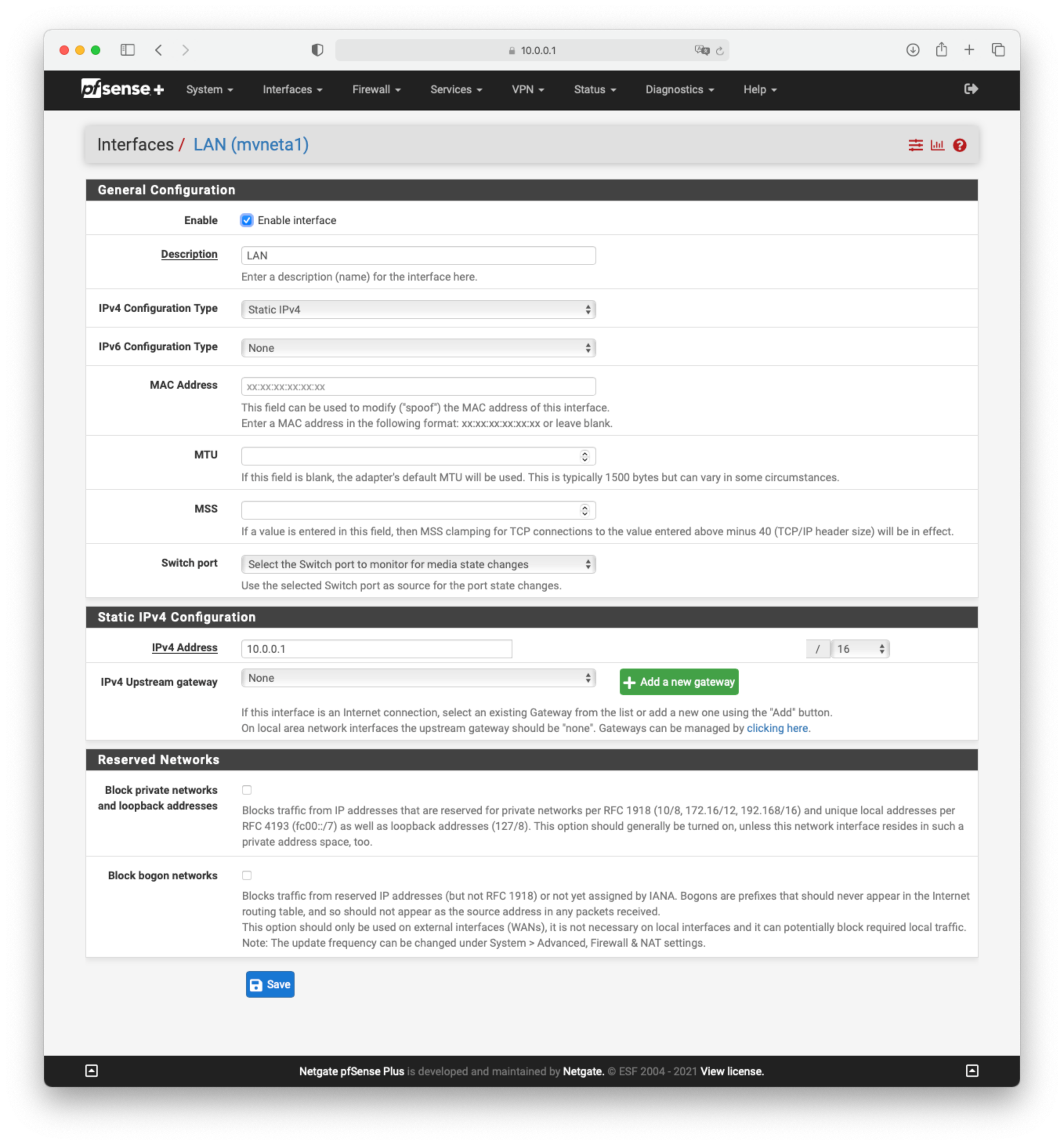Interface LAN - IPV4 10.0.0.1/16