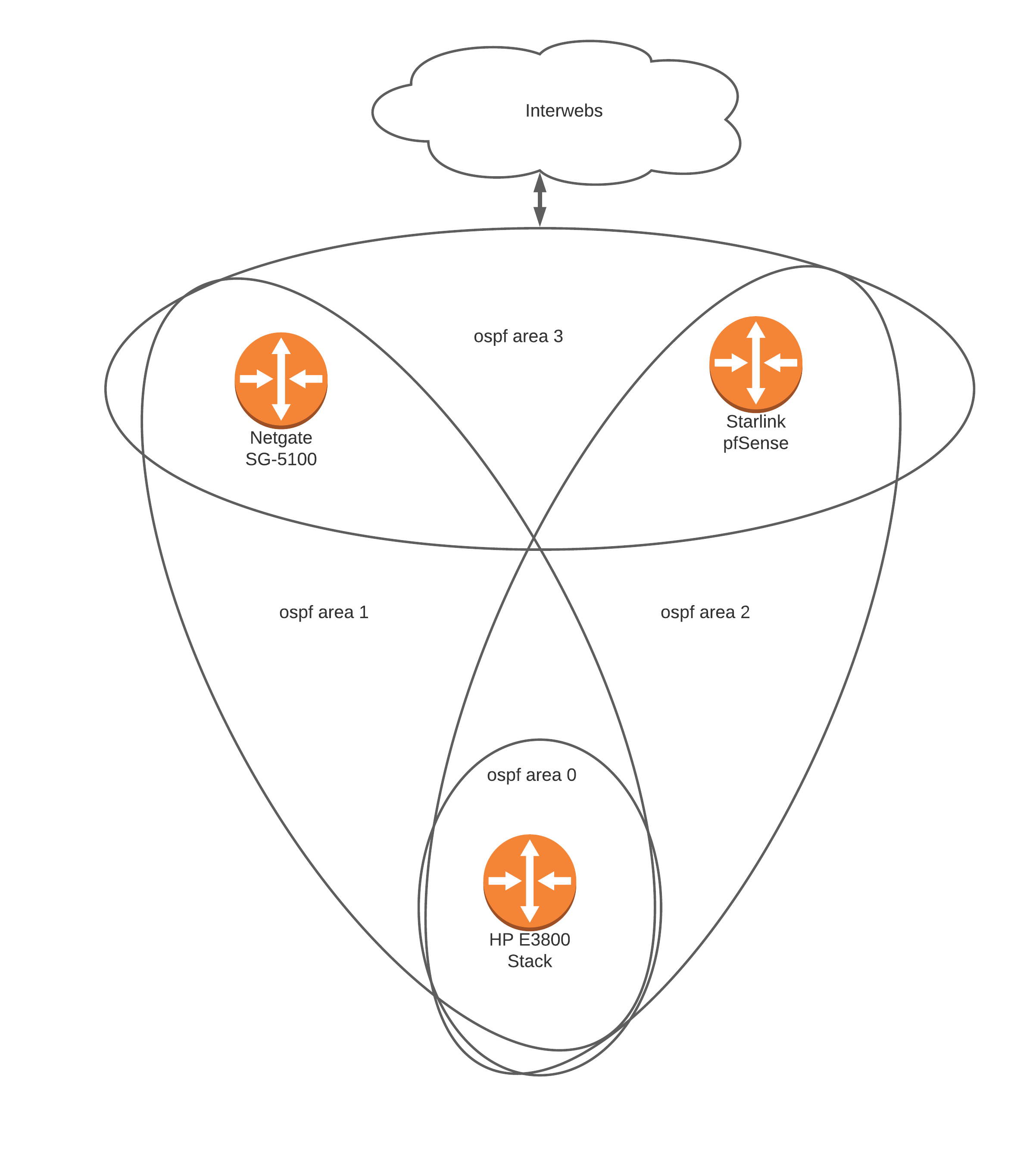 Area 1 and Area 2 are connected to pfSense boxes which are connected to my ISPs. If either router goes down, there will be a failover event from the switch on area 0 to the other.