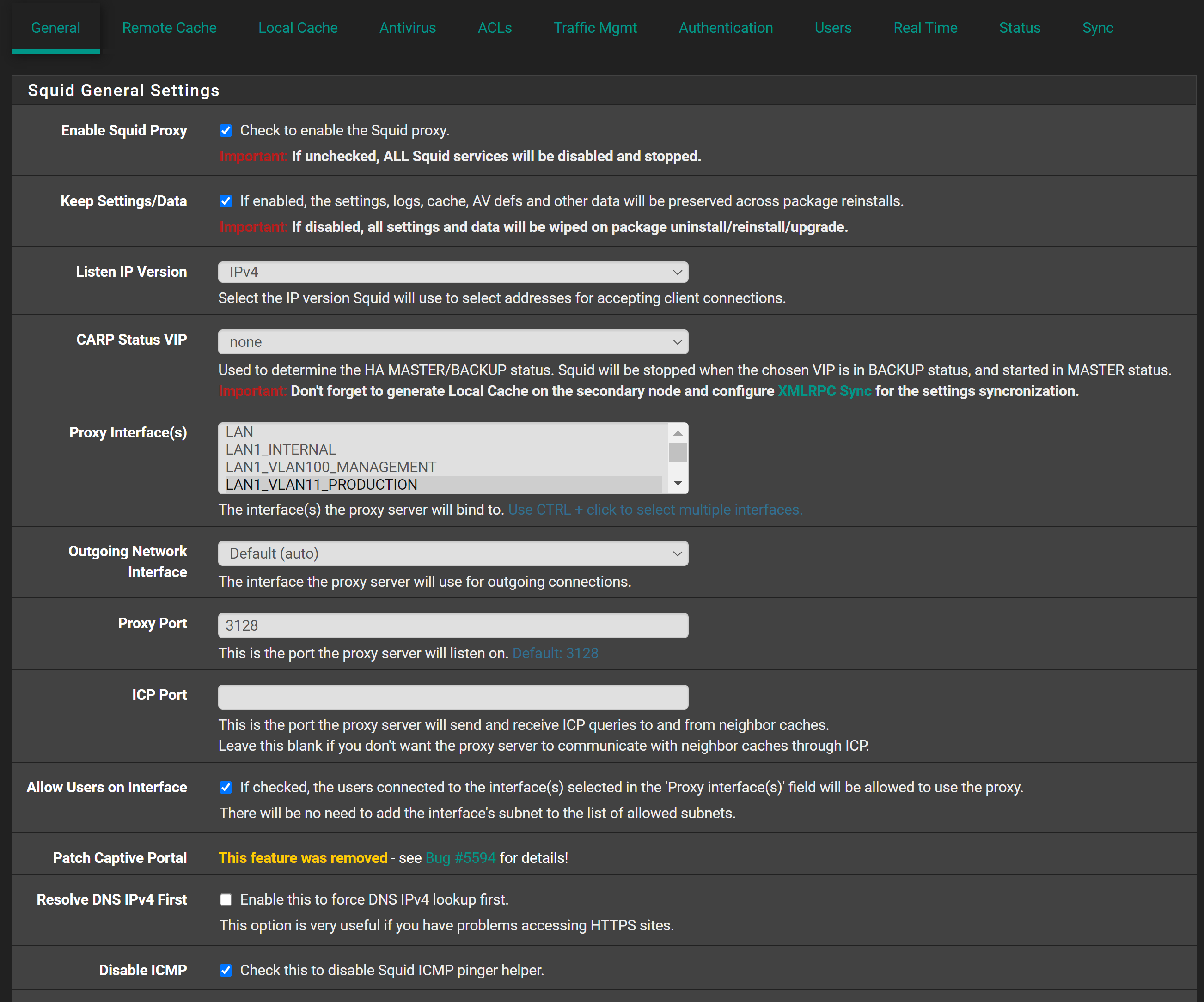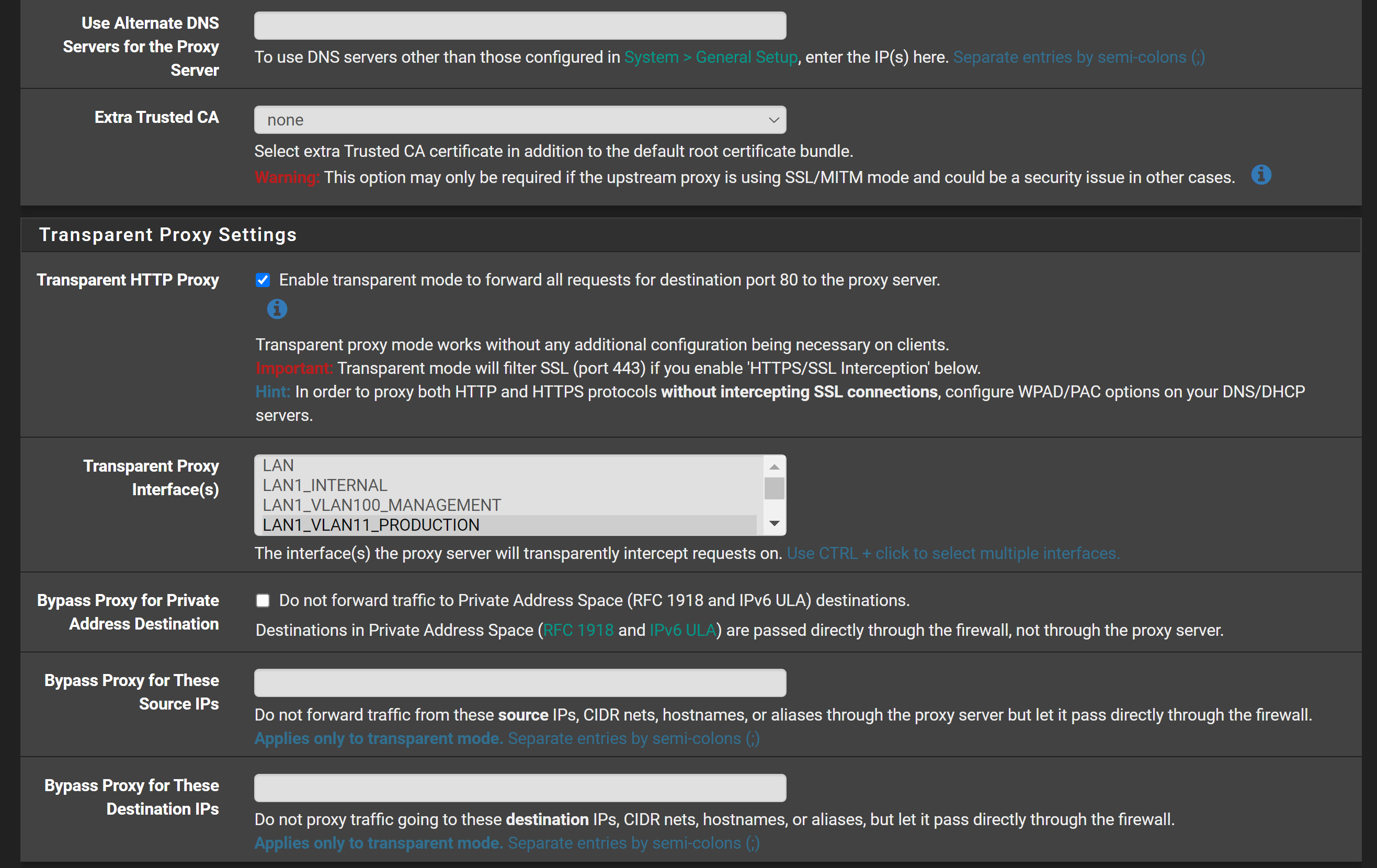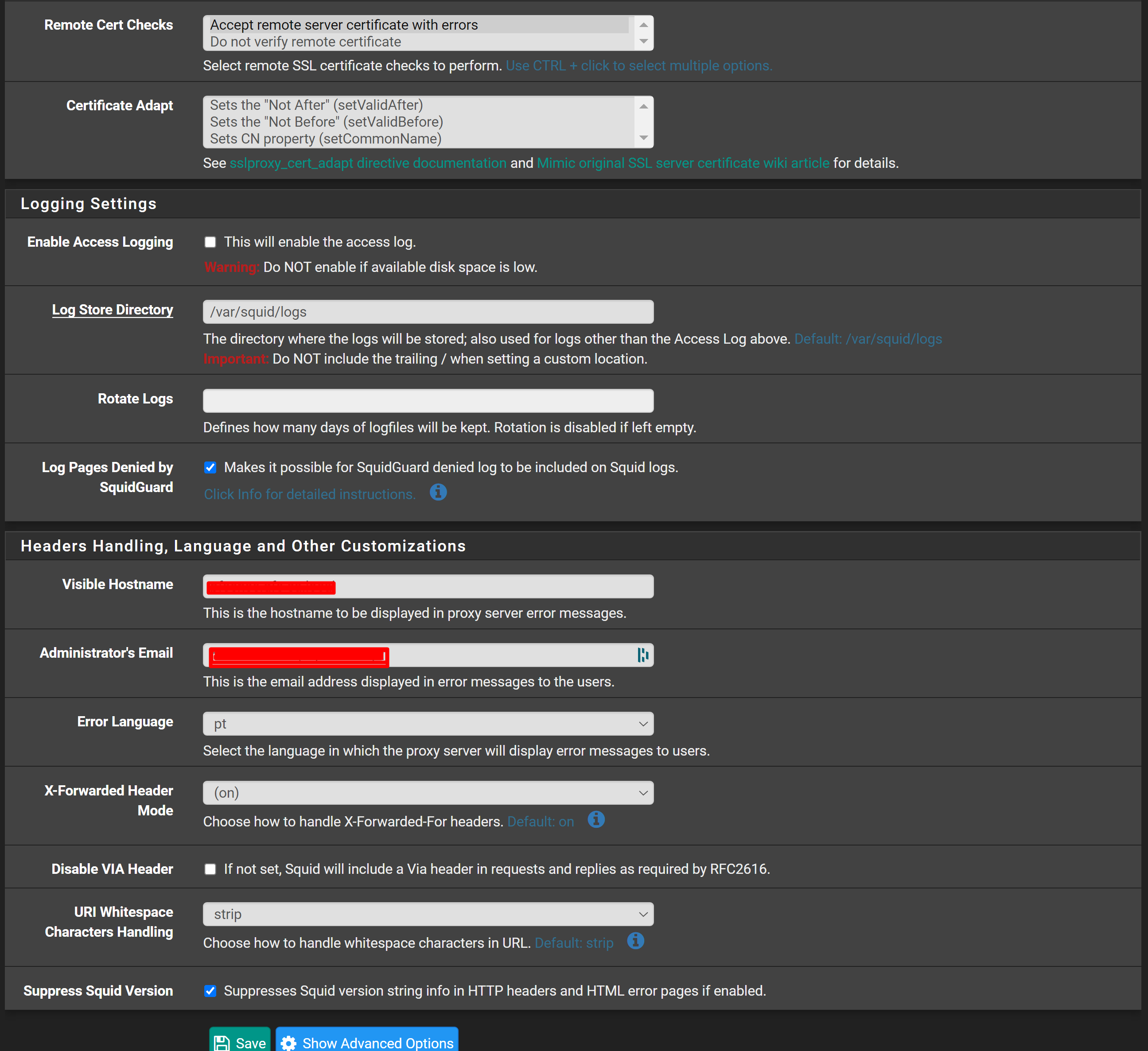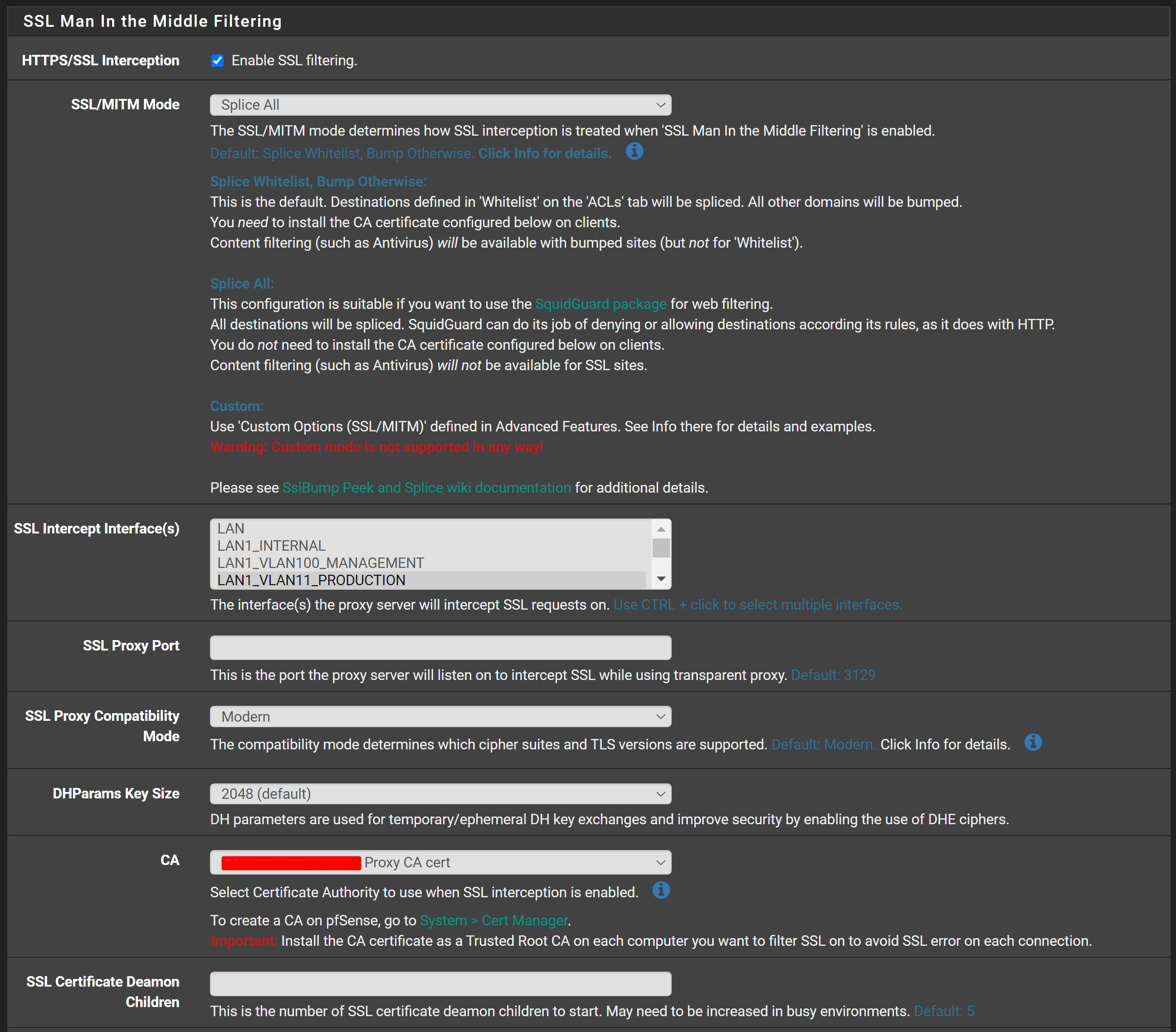 Hello everyone, I have a squid 0.4.45_3 + squidproxy 1.16.18_13 setup and running for a single interface, running as a Transparent Proxy with ACL (being all access blocked by default) and no cache. And from times to times, I have machines, doing it randomly, giving ERR_SSL_PROTOCOL_ERROR and ERR_FAILED in browsers. I've already installed the proxy cert CA, but still I am seeing those ERR_SSL_PROTOCOL_ERROR. I've also installed the SSL CA cert in every machine behind this proxy, in Trusted Root CA. In squid for SSL filtering, it says that for Splice All, doesnt need to be intalled the CA certificate in below clients, who is the same interface setup for proxy. But in CA option, for SSL interception enabled, it needs a certificated there, and there is a warning, that the CA cert must be installed in each computer to avoid SSL errors. I really dont know how it must be ... Here are the options that I have right know: