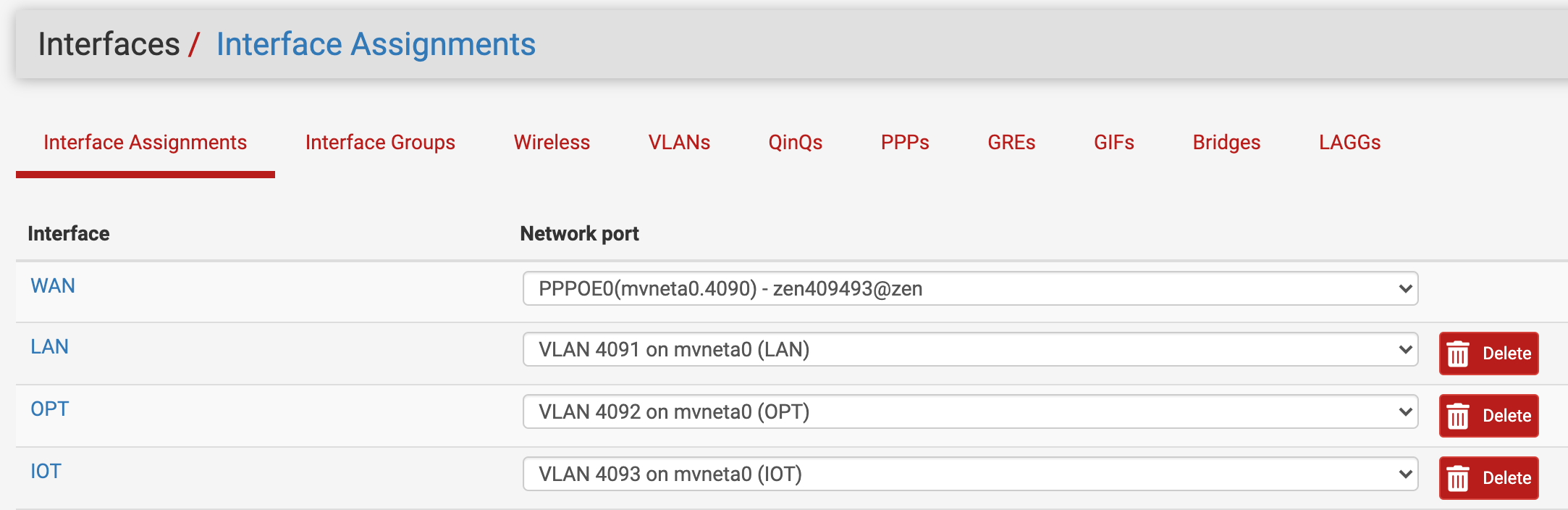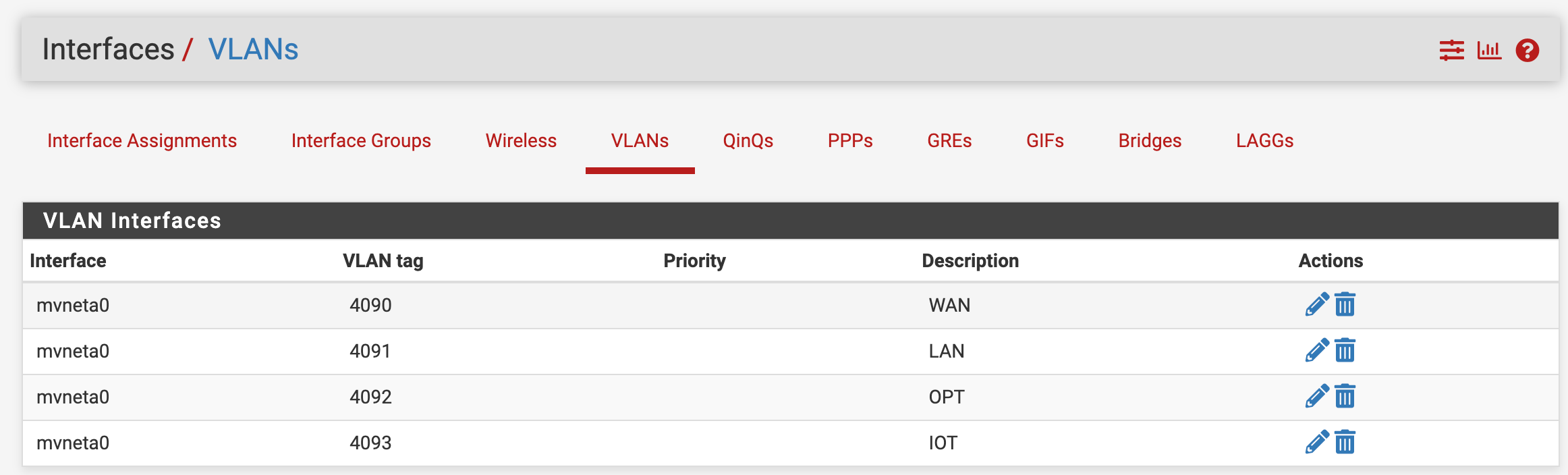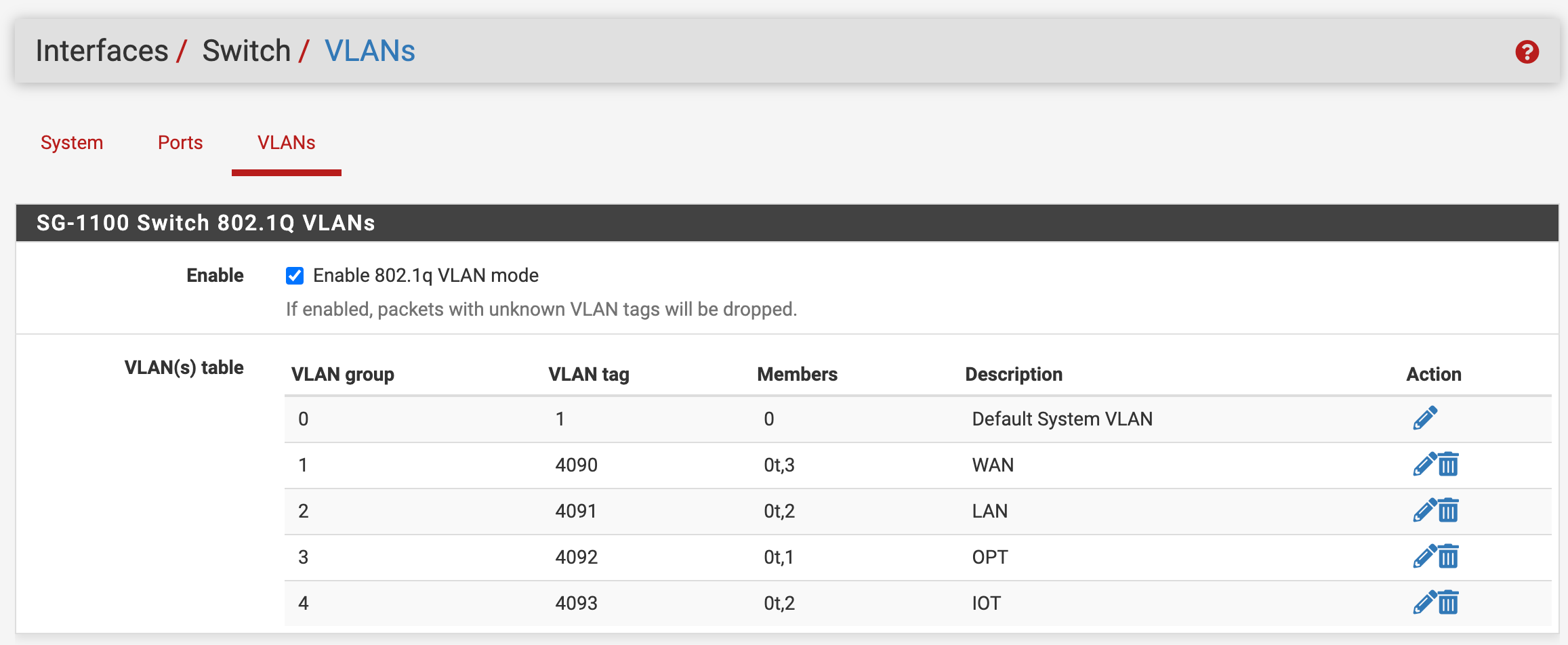 I've setup both VLAN's as interfaces named LAN & IOT, and configured DHCP. I've then setup the SG-1100 switch to route VLAN 4091 & 4093 via port 2, untagged.