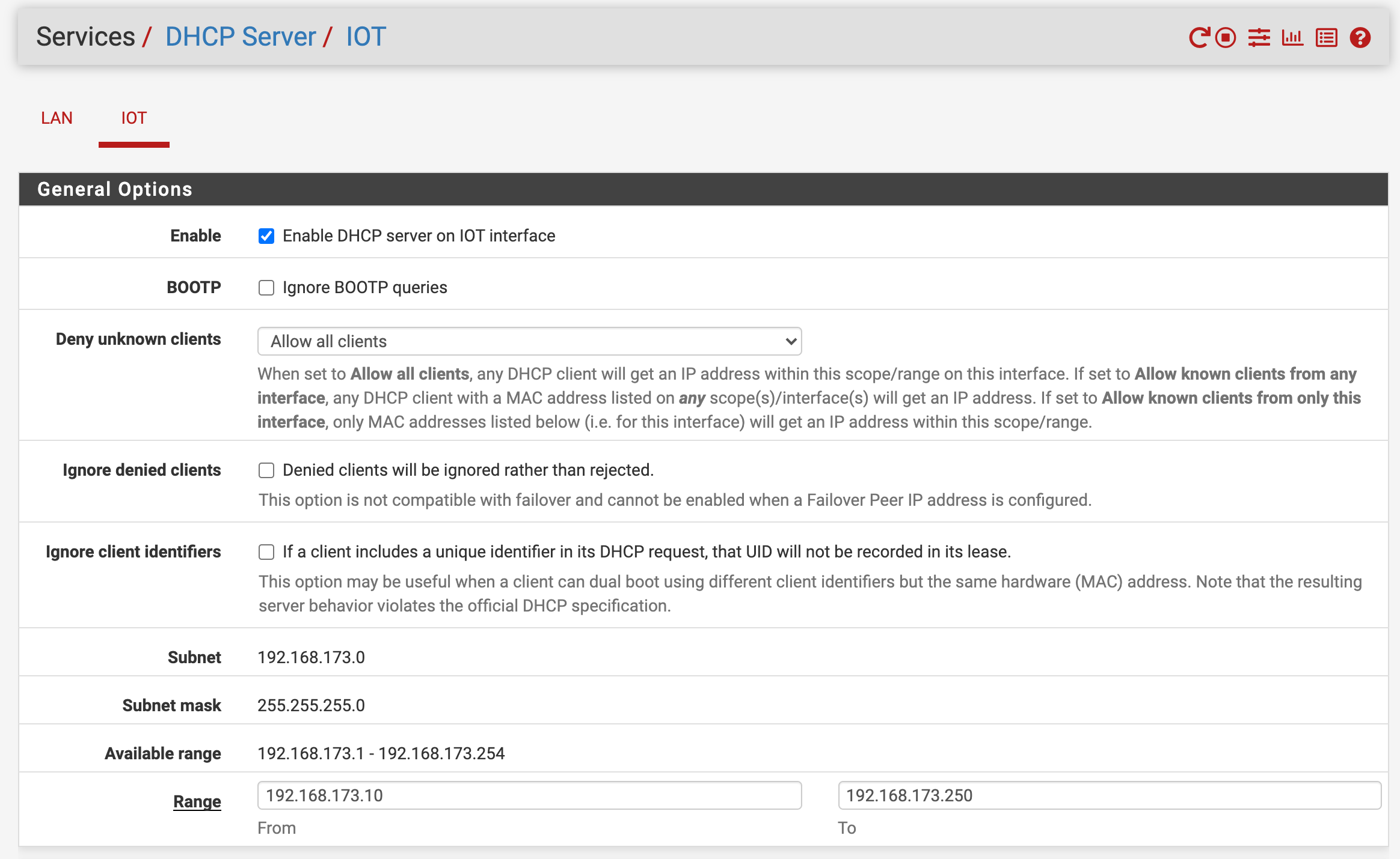VLAN 4093 - IOT. 192.168.173.0/24 used as internet of things with no access to LAN (via firewall rules). DHCP configured to allow all clients.