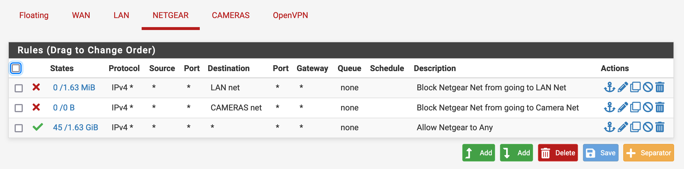 At any rate, I have 2 separate networks. LAN 192.168.1.0/24 and NETGEAR 192.168.80.0/24. For the life of me I can't get the proper rule setting to allow a specific host from 1.0 network in to the 80.0 network. I've tried as many variations as I can think of with no luck.