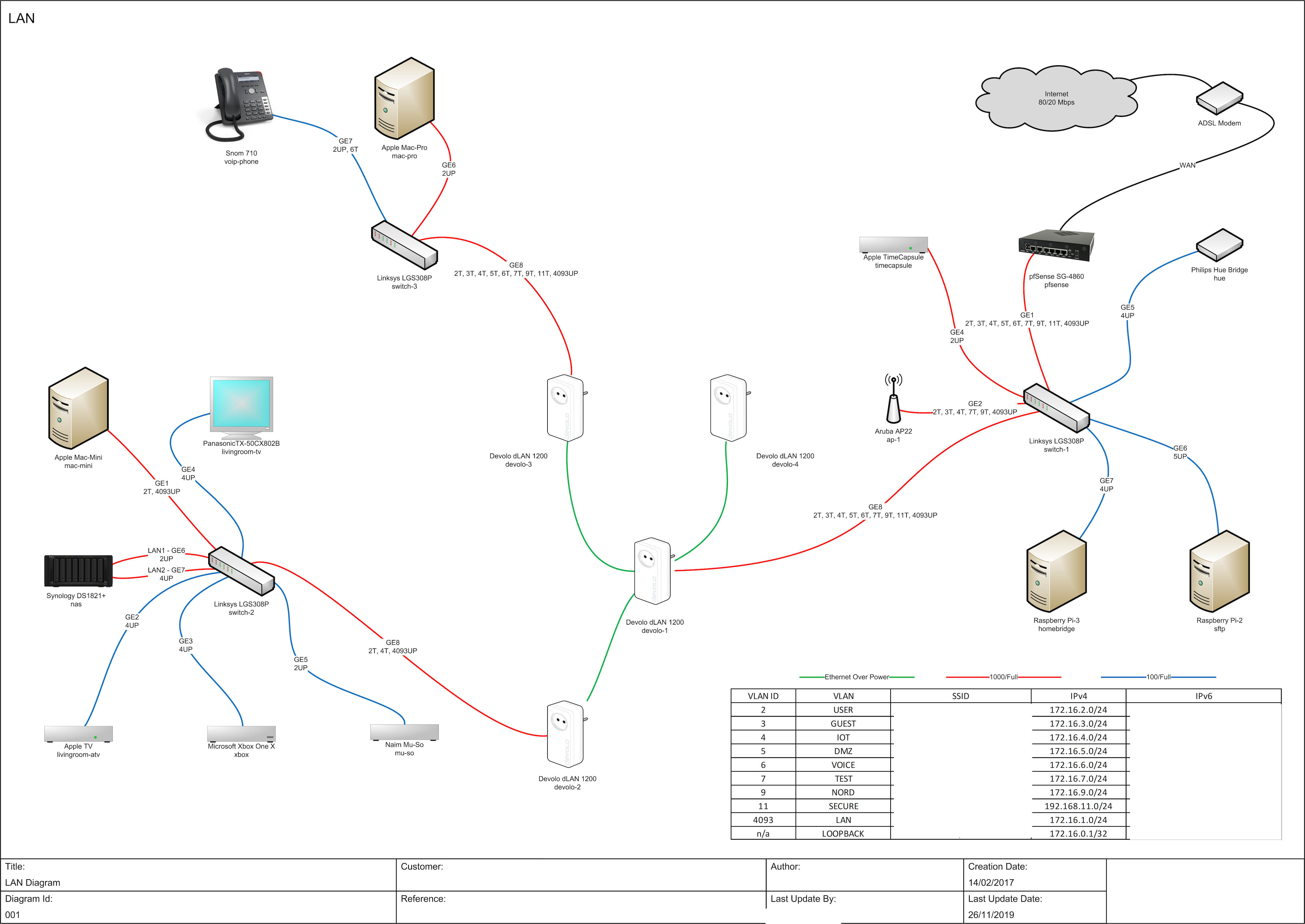 pfsense -- vlanSwitch1 -- powerlineA --- powerlineB -- vlanSwitch2 -- devices..