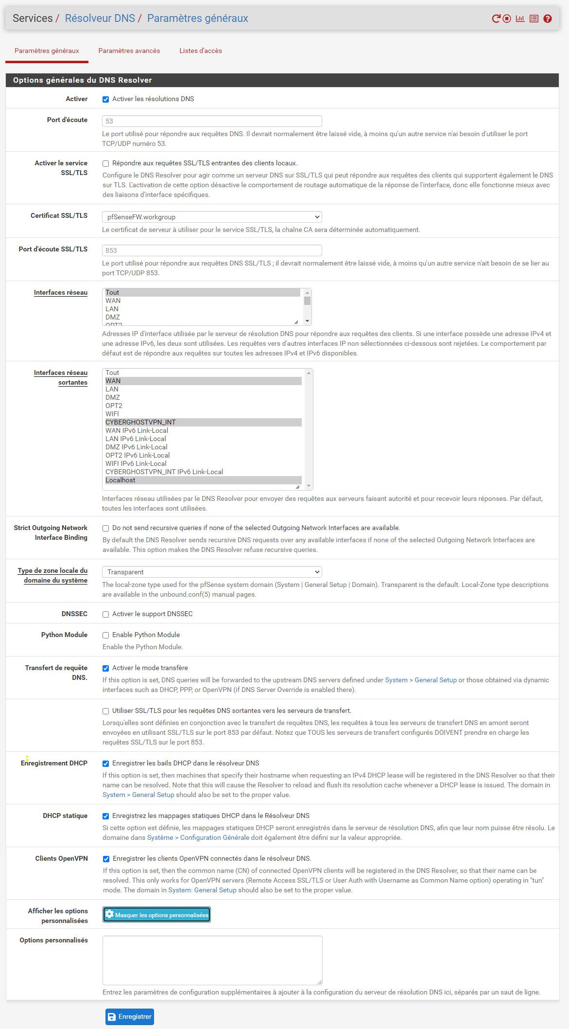 Tout d'abord désactive l'interface de sortie WAN du DNS resolver et laisse seulement l'interface de sortie de ton VPN