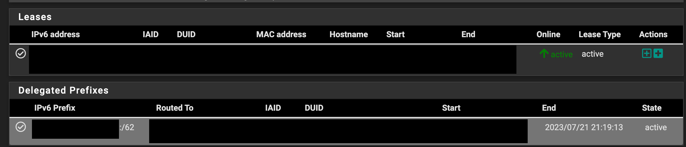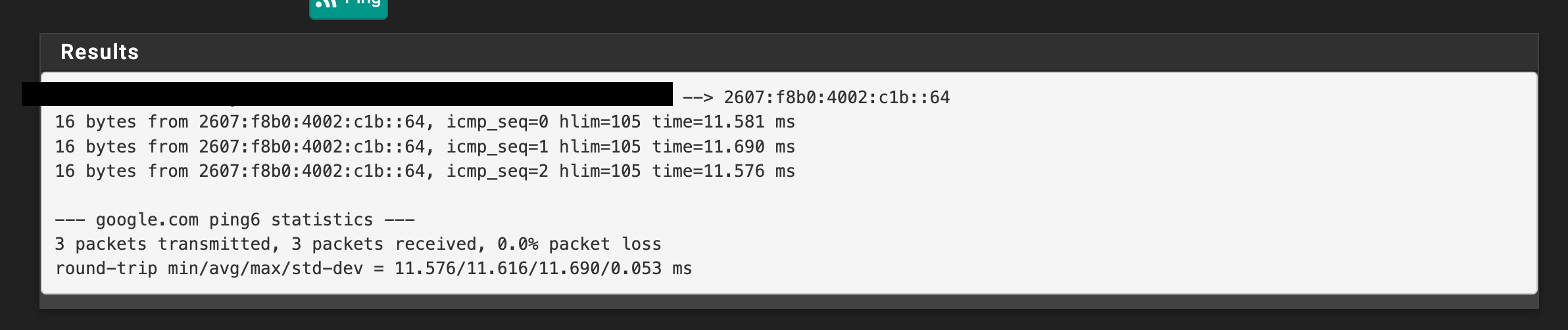 I've got a firewall rule that allows this prefix to go to any address using any protocol and I enabled logging so I can clearly see that isn't the issue. I only get a /60 from my ISP (AT&T) so I'm delegating a /62 to my other router.