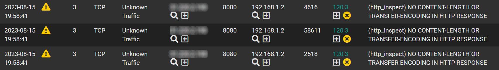 How is this possible?I also checked the Blocked list and I see a bunch of "(http_inspect) NO CONTENT-LENGTH OR TRANSFER-ENCODING IN HTTP RESPONSE". So to test I go in the Alerts list, click on the X under the list number to ignore this rule blocking.