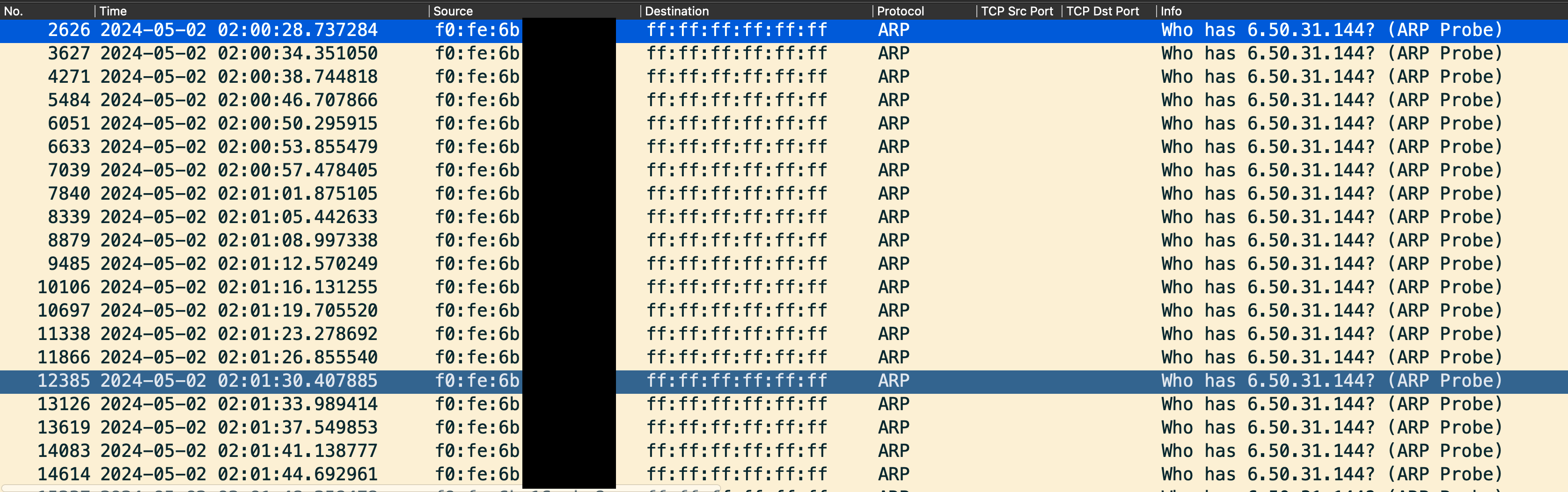 Can anybody help me figure out what this device is trying to do and why it would be doing these ARP requests for this IP? The device MAC vendor is f0:fe:6b:XX:XX:XX.