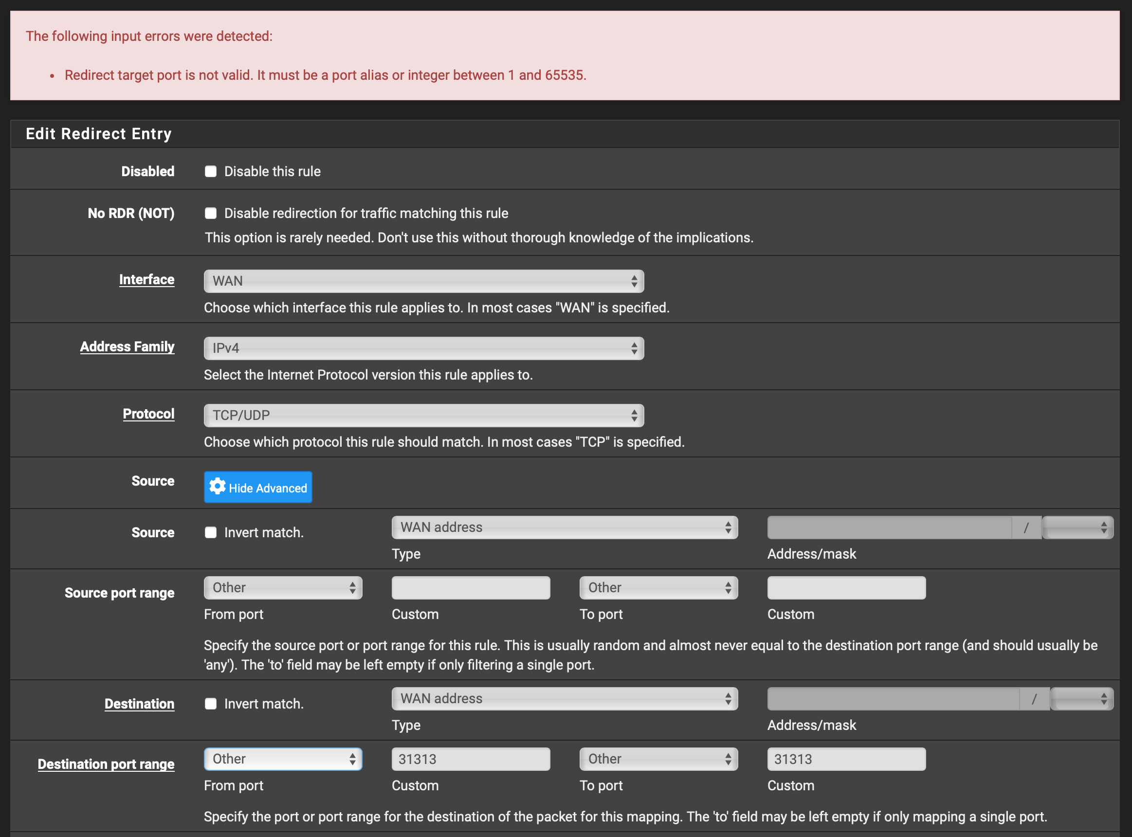 Redirect target port is not valid. It must be a port alias or integer between 1 and 65535.