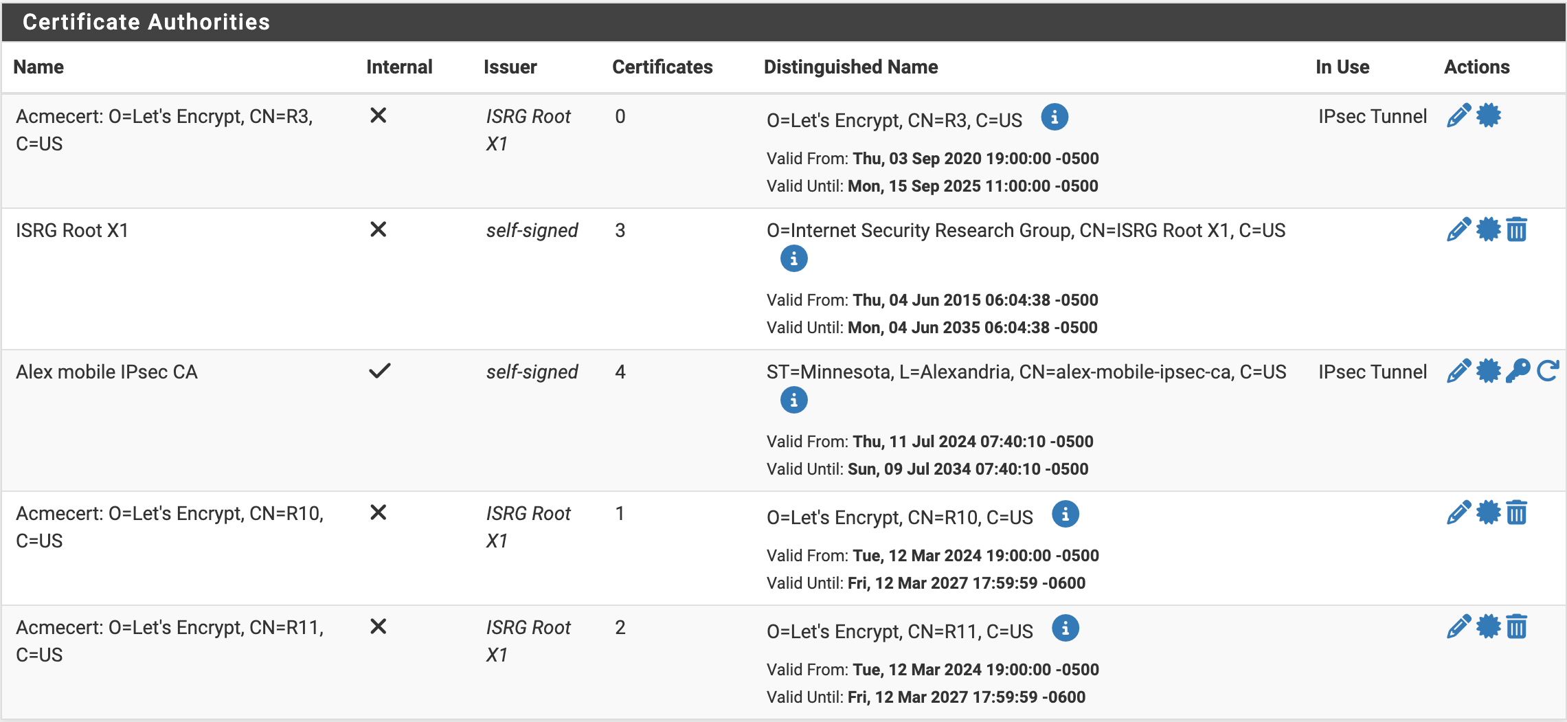 Most recently I had enabled Mobile IPsec which also used LE certs but I do not think this is relevant to the problem. The ACME / LE certs have been renewing normally & I could see that the newest ones were referencing intermediate R10 and R11 certs, so my first effort was to delete the manually imported ISRG Root X1 CA cert because that cert is now in the OS trust store (verified by certctl -v list | grep ISRG). OS trust store has both X1 and X2 CA certs. I deleted the X1 CA cert on both firewalls and rebooted. Tunnel would not come up. The R3 intermediate CA cert was still showing as in use by IPsec Tunnel (which I later found was due to P1 Peer Certificate Authority set to use R3).
